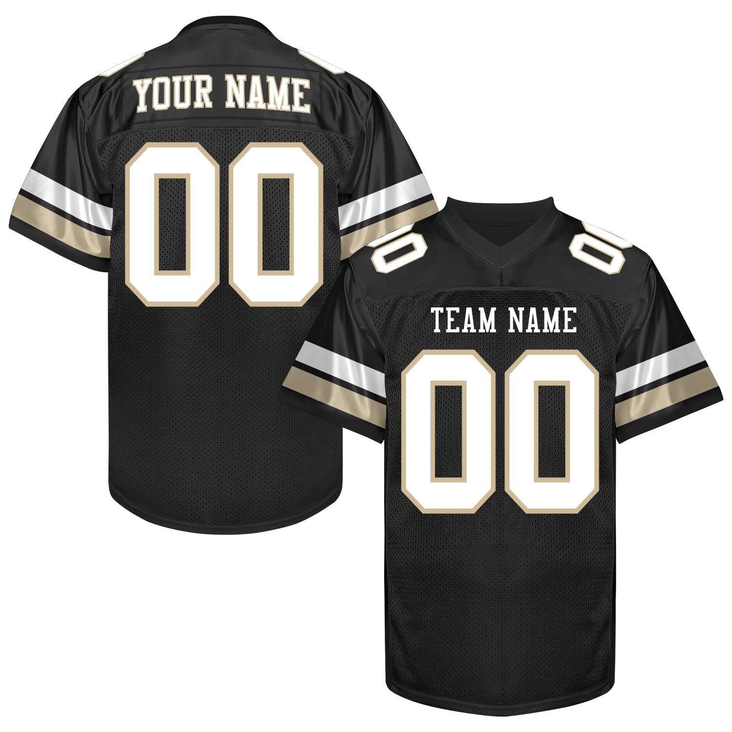 Custom Black Football Jersey Name Number Logo, Black White Gold Football Uniform Men Women Youth Kid, Game Day Sports Jersey Uniforms