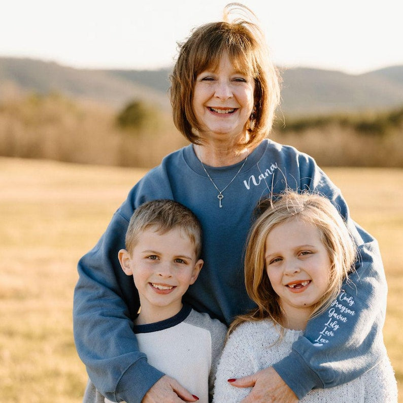 Custom Embroidered Mimi Grandma Gigi or Any Text on Neckline Sweatshirt, Names on Sleeve, Personalized Gift for Mom Momma Nana Sweater