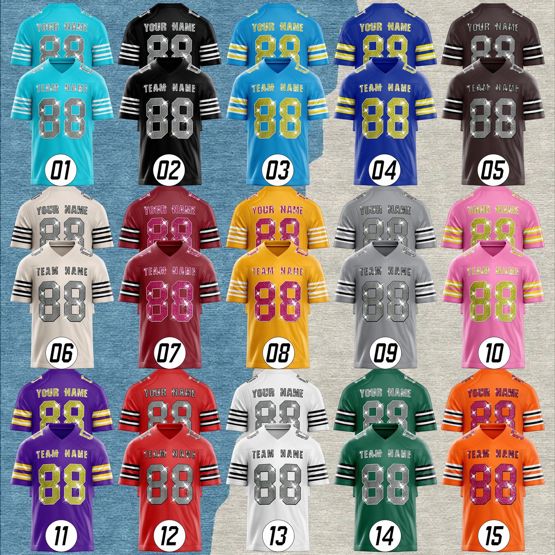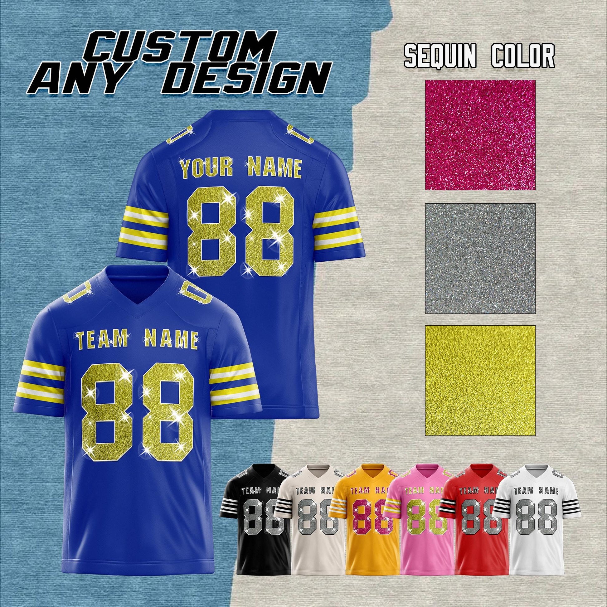 Custom Football Jersey: Sequins Glitter Text, Stitched Name & Number for Men Women Youth