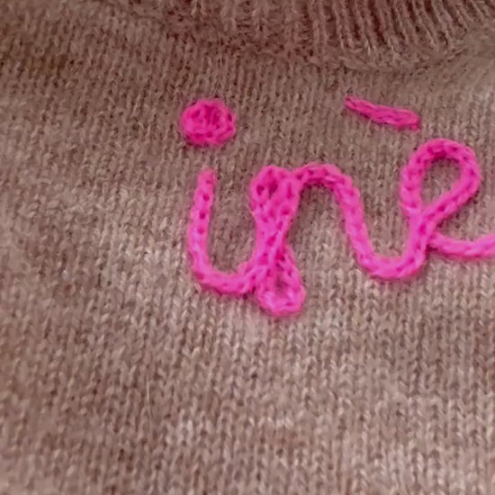 Made to order! Custom personalize your own one of a kind cashmere crewneck sweater with fluffy chainstitch embroidery. Mix and match colors to express yourself for a beautiful piece of wearable art.