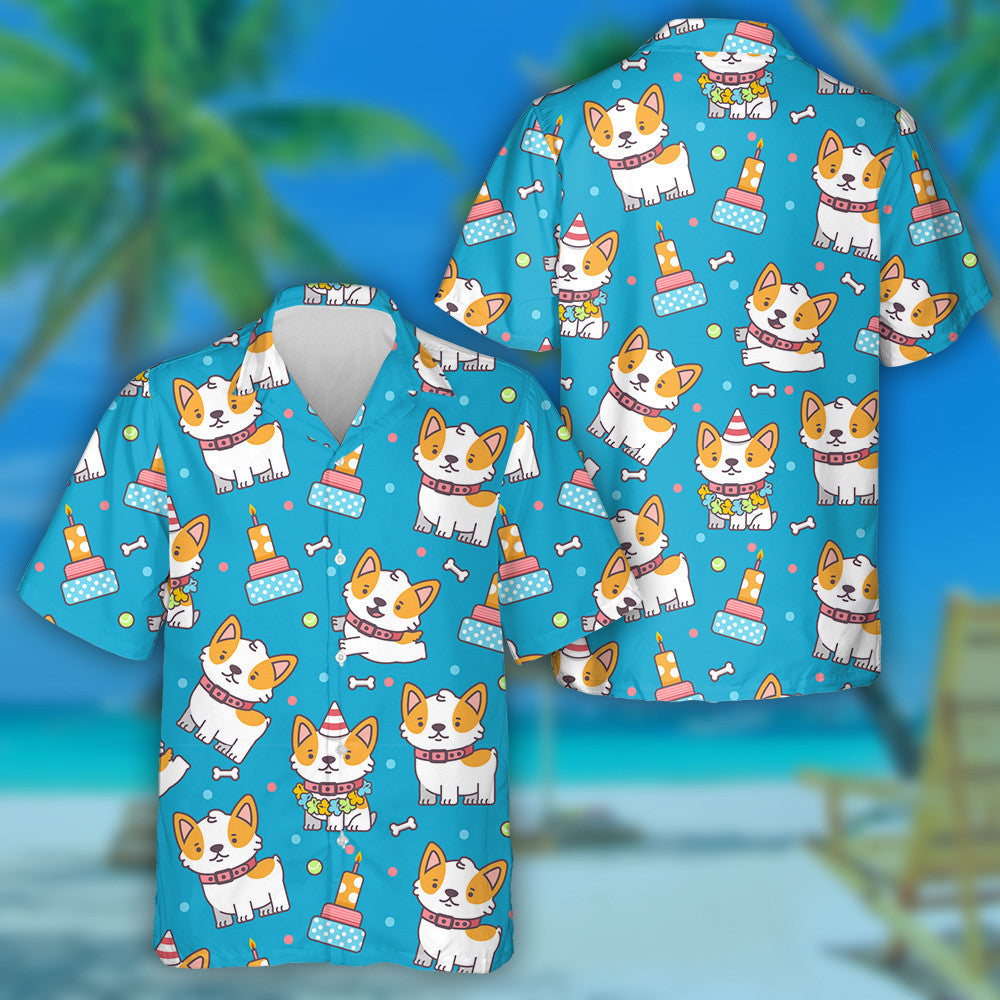 Cute Corgi And Cake Cartoon Background Hawaiian Shirt,Hawaiian Shirt Gift, Christmas Gift