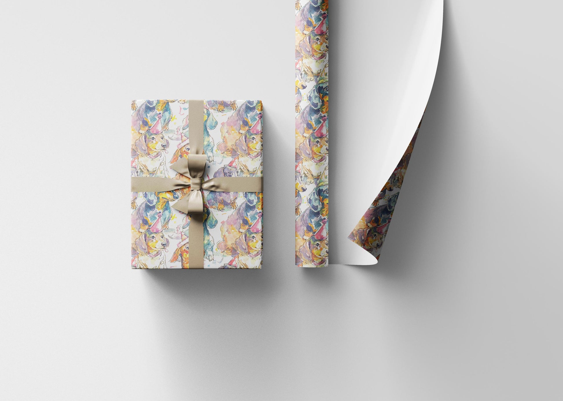 • 1 roll/sheet of custom-printed gift wrap in your selected size and finish