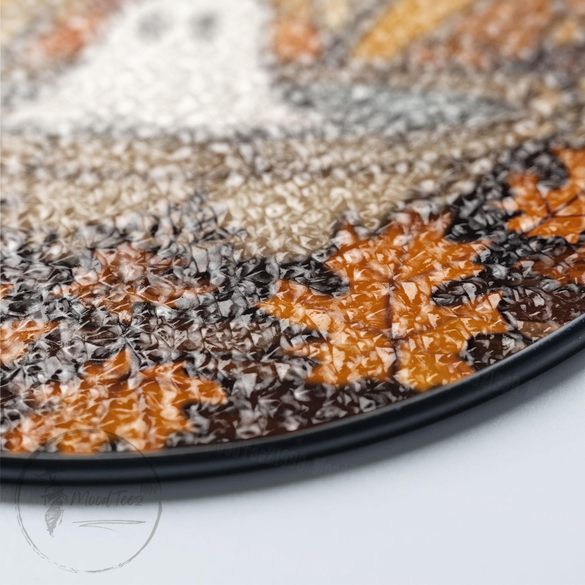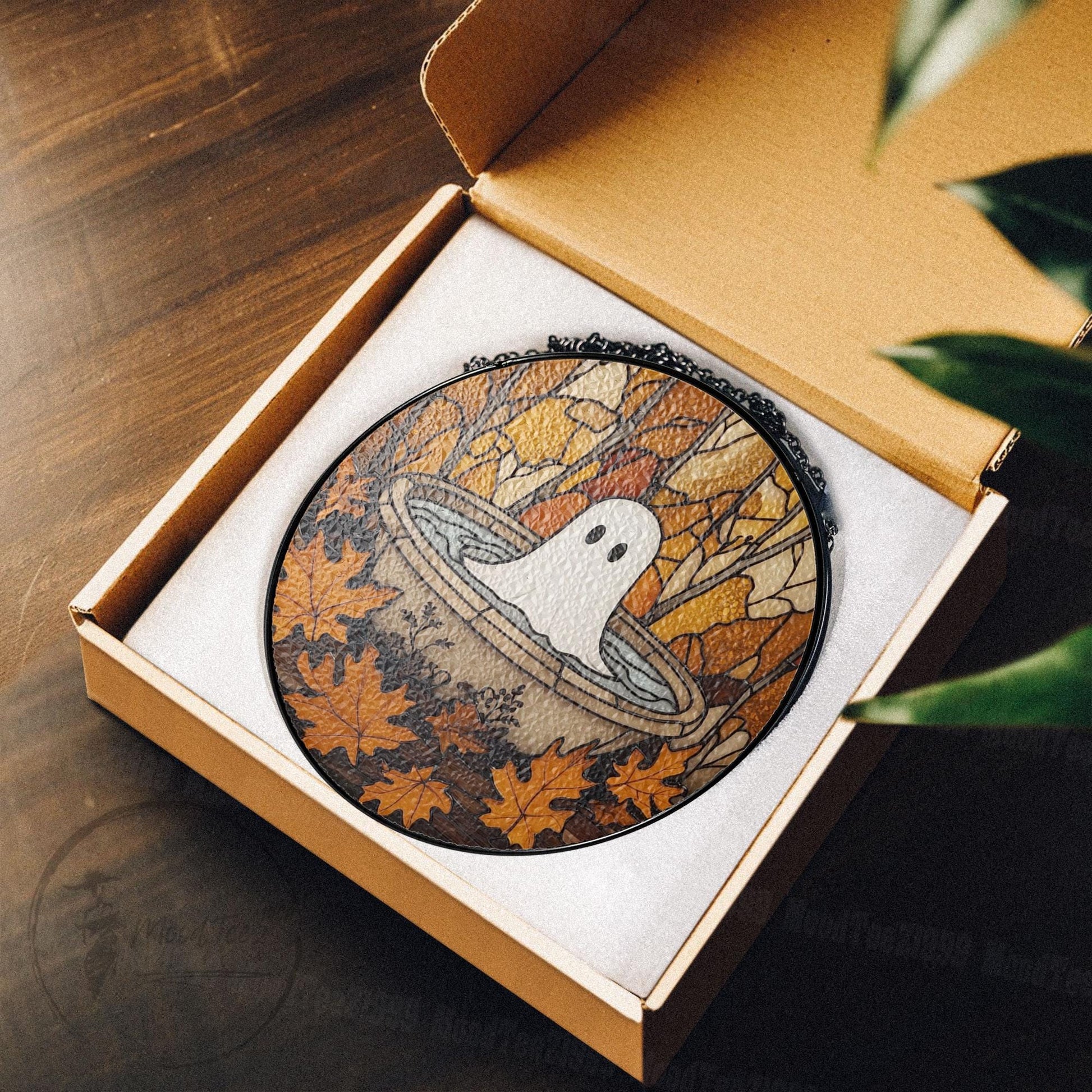 Cute Ghost in Fountain Stained Glass Suncatcher, Round Halloween Window Hanging, Autumn Leaves Fall Decor, Spooky Yet Cozy Gift Idea
