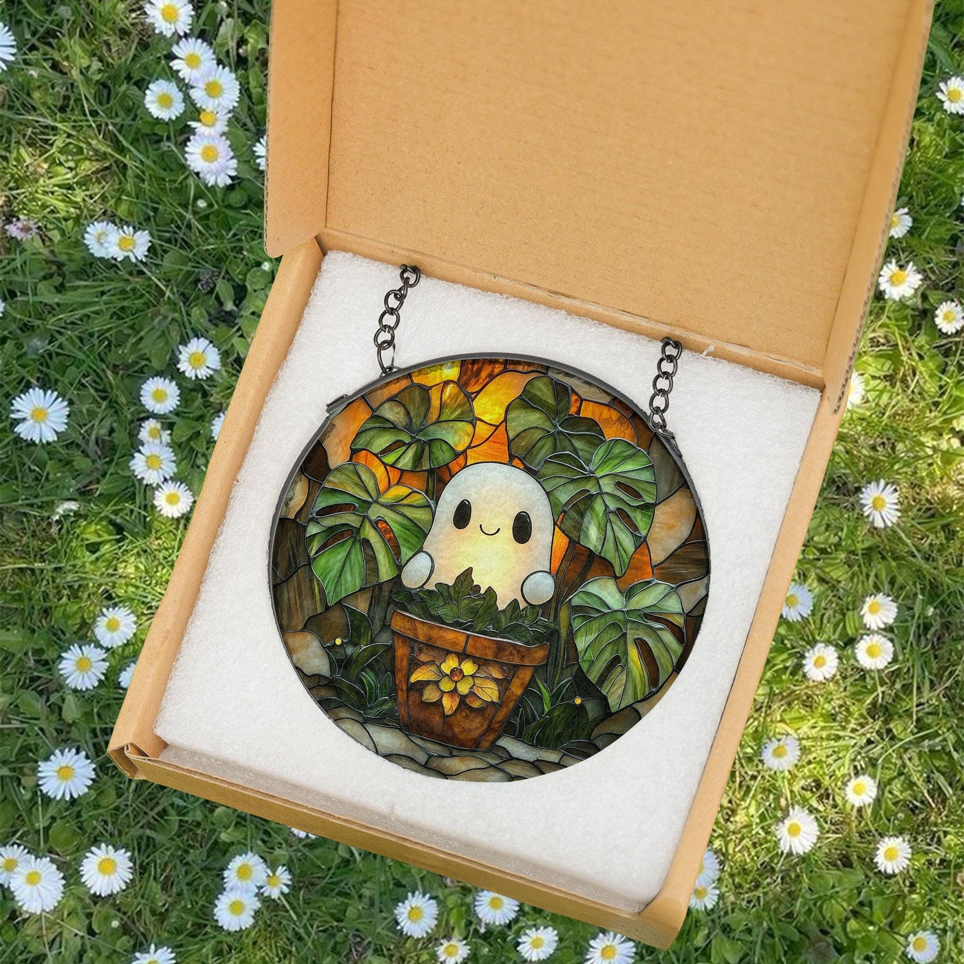 Cute Ghost Plant Suncatcher, Glass Suncatcher Decor, Pendant Wall Window Ornament, Halloween Ghost Glass Suncatcher, Plant Lovers Gift