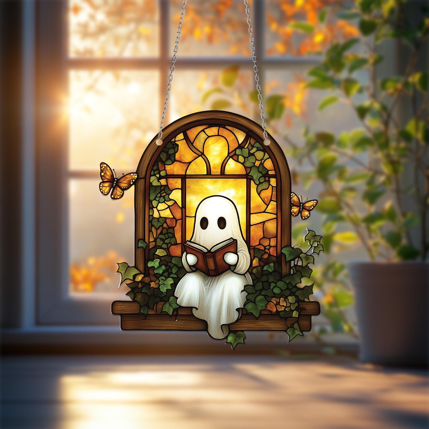 Cute Ghost Reading Book Window Hanging, Cozy Halloween Decor with Butterflies and Ivy, Whimsical Autumn Home Accent