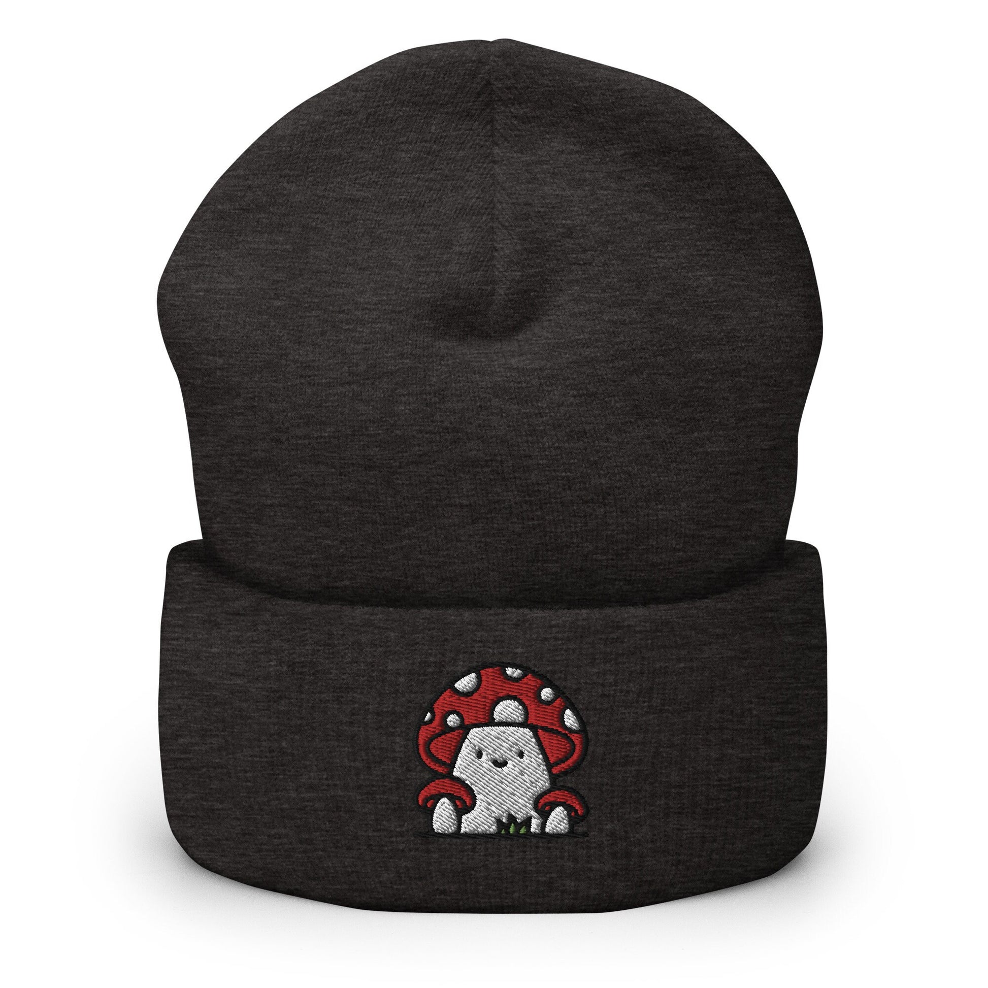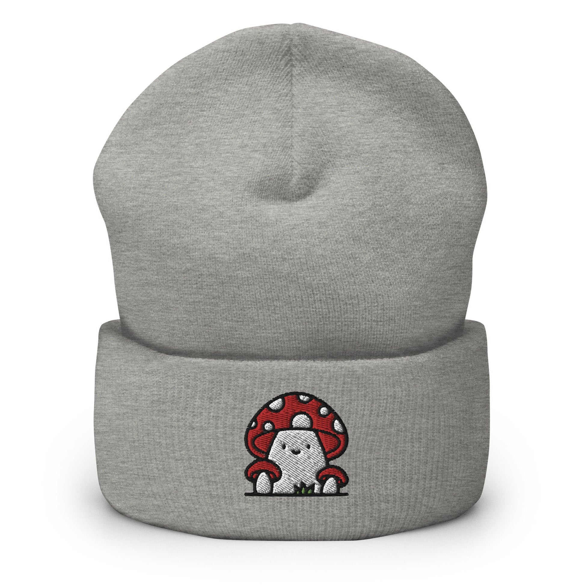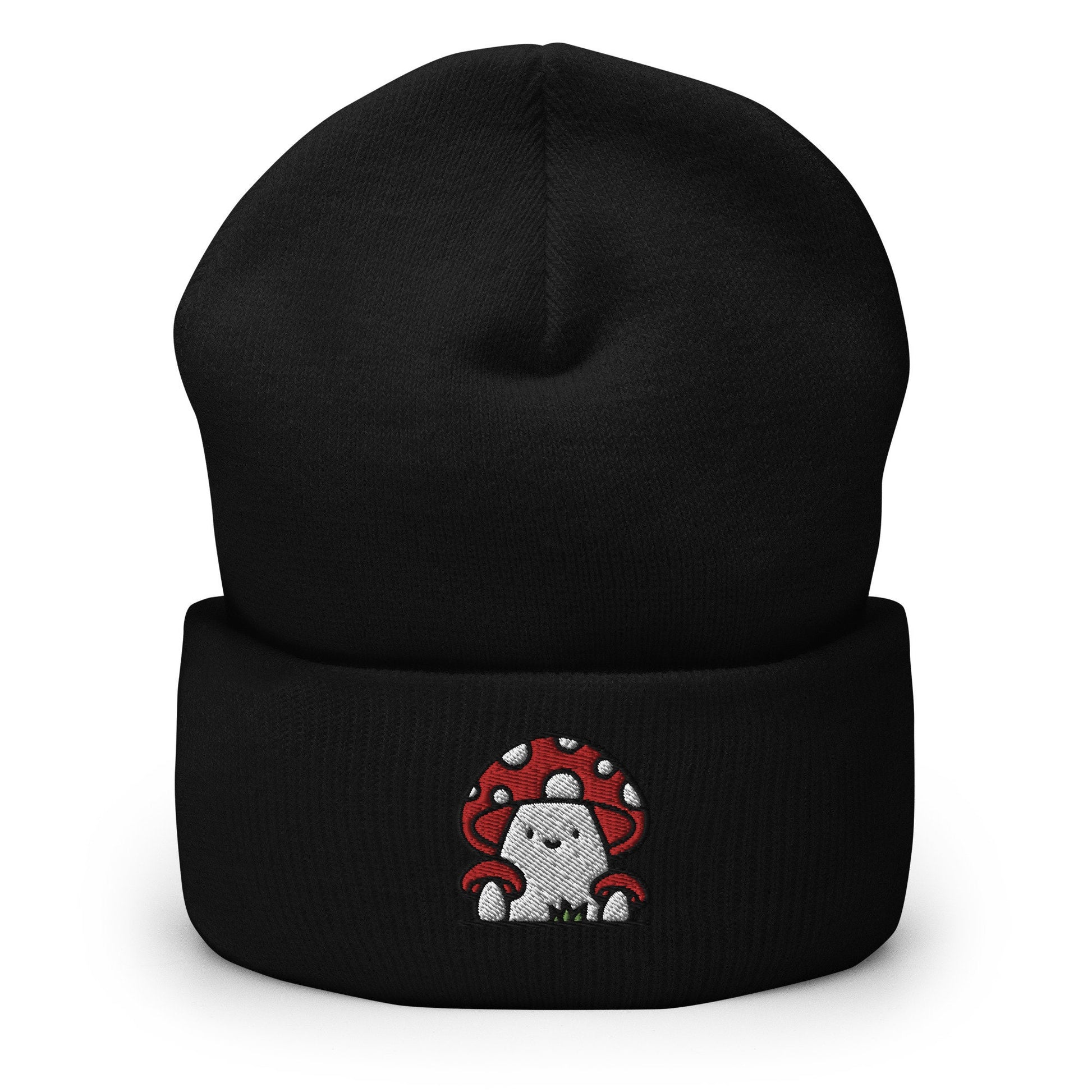 Cute Red Mushroom Family Embroidered Beanie, Handmade Cuffed Knit Unisex Slouchy Adult Winter Hat Cap Gift