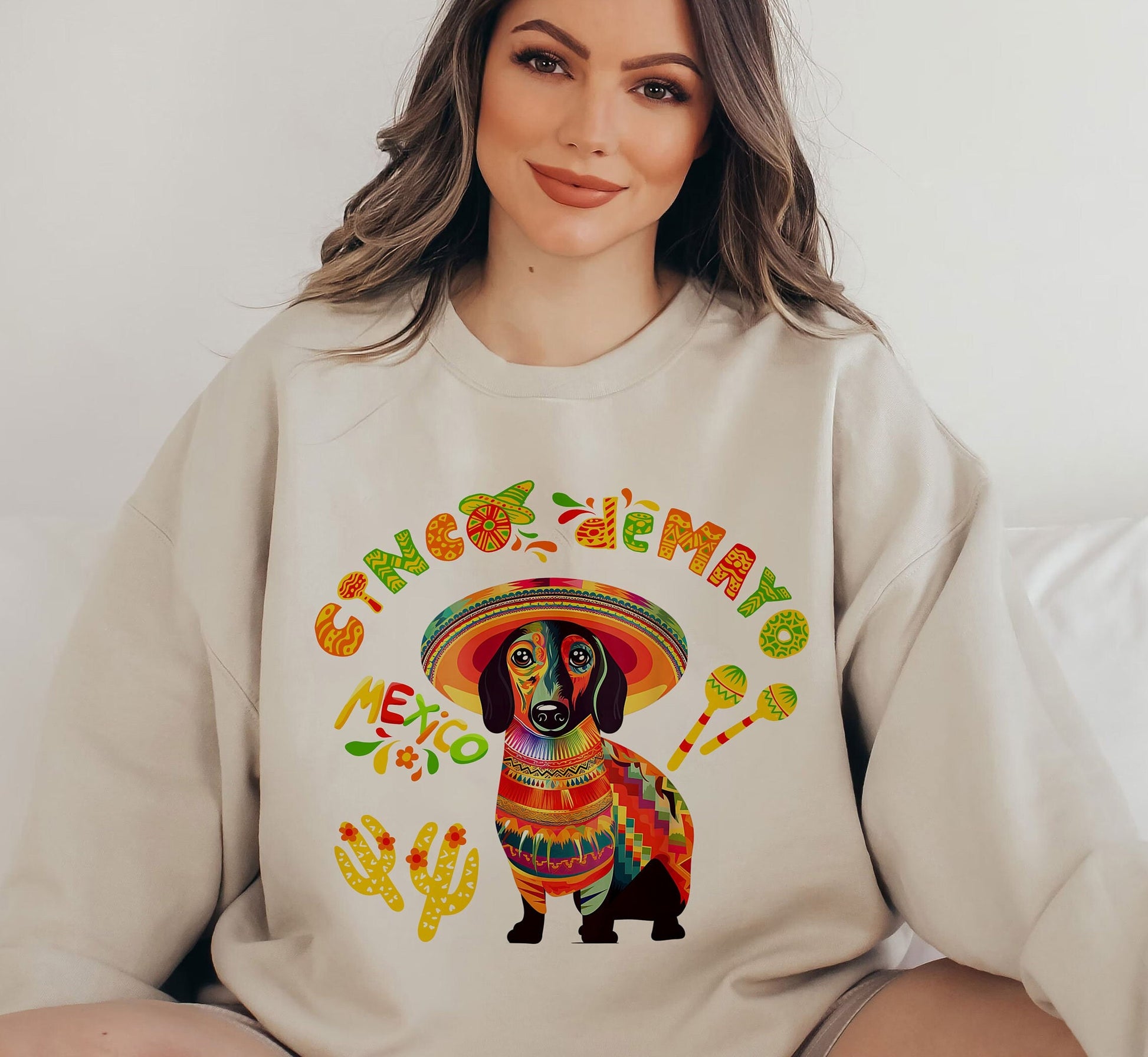 Dachshund Dog In Mexican Cinco De Mayo Sombrero And Poncho Sweatshirt, Mexican Festival Gift Shirt, Happy Cinco De Mayo, Fiesta Party Shirt