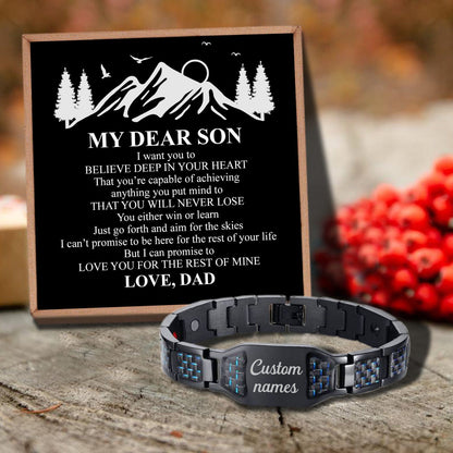 If you're looking for an awesome men's bracelet for son. This "Dad To Son - You Will Never Lose Customized Bracelet" is the most perfect one! This customized name bracelet is beautifully designed and perfectly matched for any outfit style. Also, it can be engraved your son's name to personalize it as a special gift for him and comes together with a gift card that is beautifully printed a meaningful message to show how much you love your son and will always support him. So, it will be a special gift set to make him always miss you!