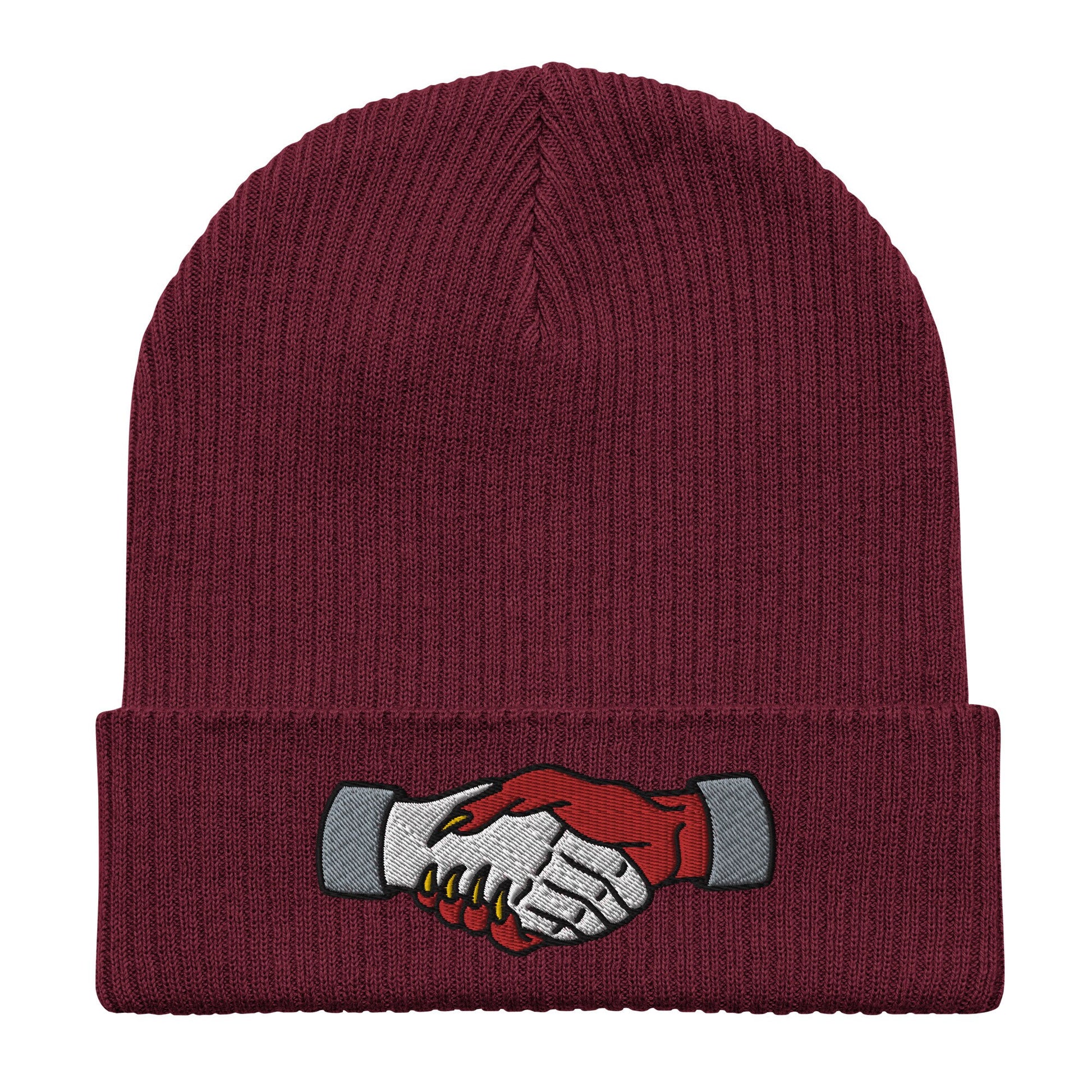 Demon Handshake Embroidered Beanie, Tattoo Inspired Clothing, Tattoo Flash, Unisex Cuffed Knit Hat, Tattoo Apparel, Ribbed Knit Beanie