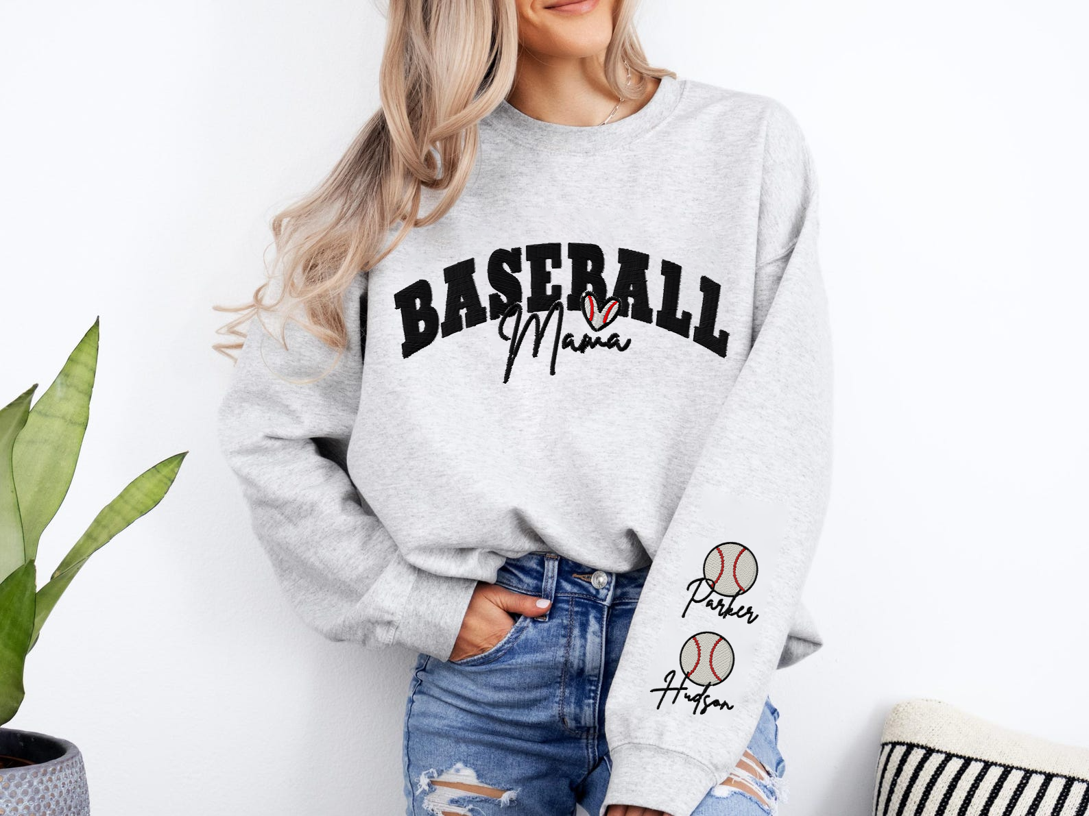 Embroidered Baseball Mom Sweatshirt, Baseball Mama Sweatshirt Name on Sleeve, Custom Embroidered Baseball Mom, Gifts for Mother's Day