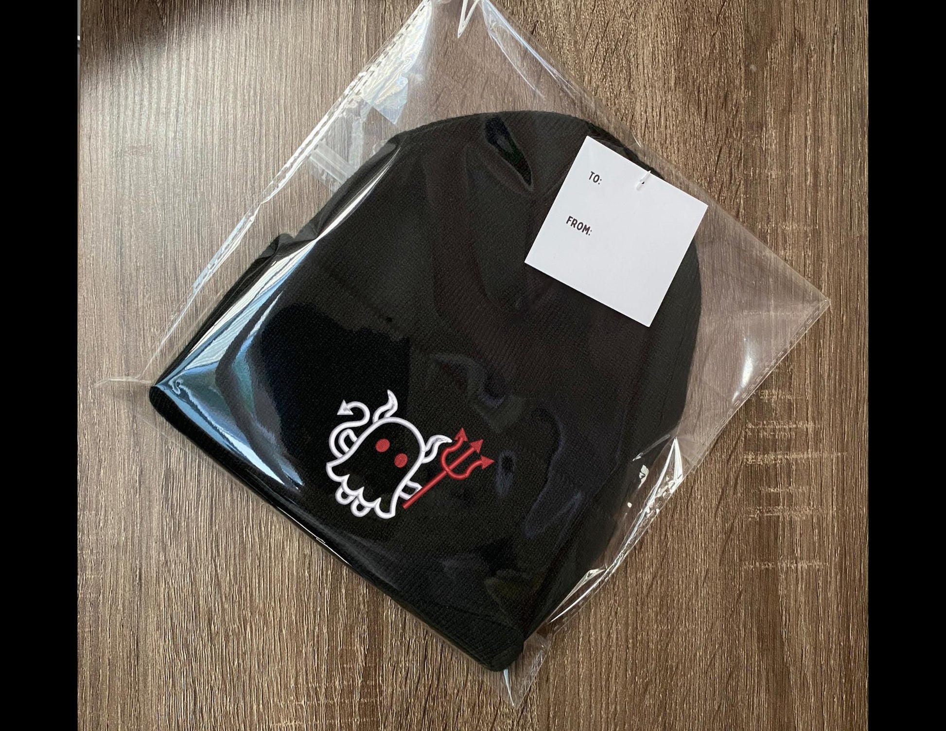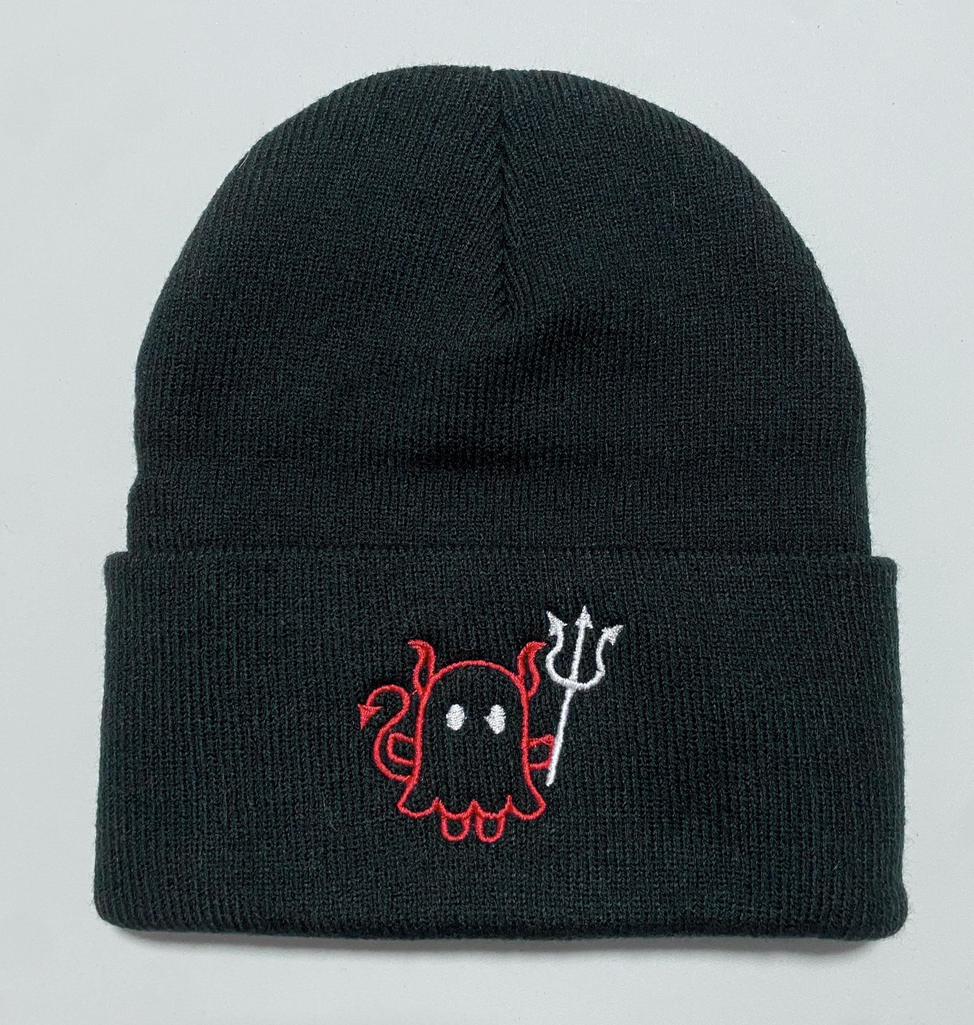 Embroidered Cute Ghost Devil w Pitchfork Beanie, Gift for Halloween, Spooky Casual Halloween Winter Wear, Simple Cute Winter Hat