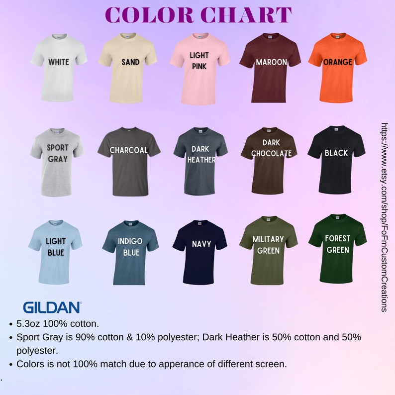 - Brand: Gildan. Our top-selling shirt colors consist of Sand, Black, White, Sport Gray, Dark Chocolate, Forest Green, Light Pink, Light Blue, Maroon, Navy, Charcoal, Dark Heather, Royal, Orange, Military Green, and Indigo Blue.