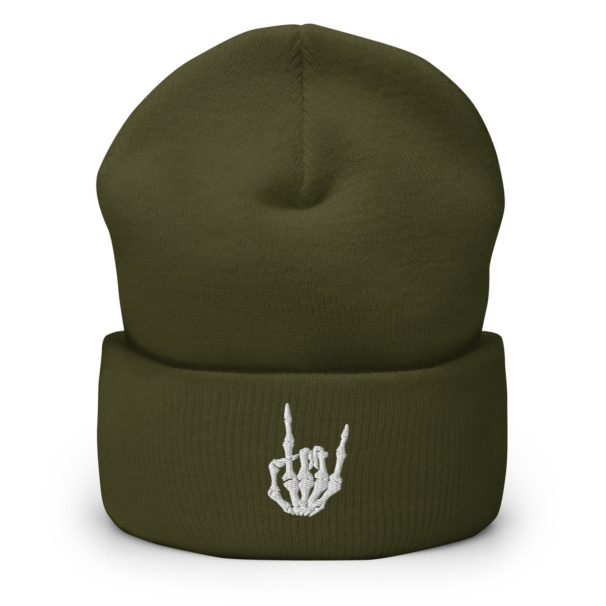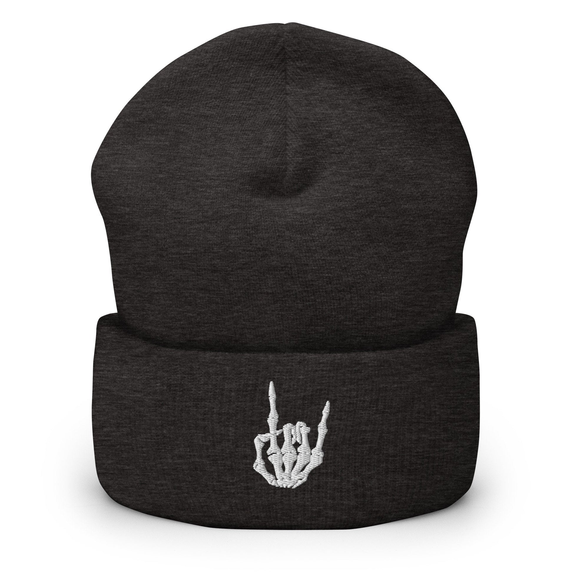 Embroidered Skeleton Hand Rock-On Beanie, Metal Hand Sign Of The Horns Halloween Toque, Two Finger Salute Woolly Hat