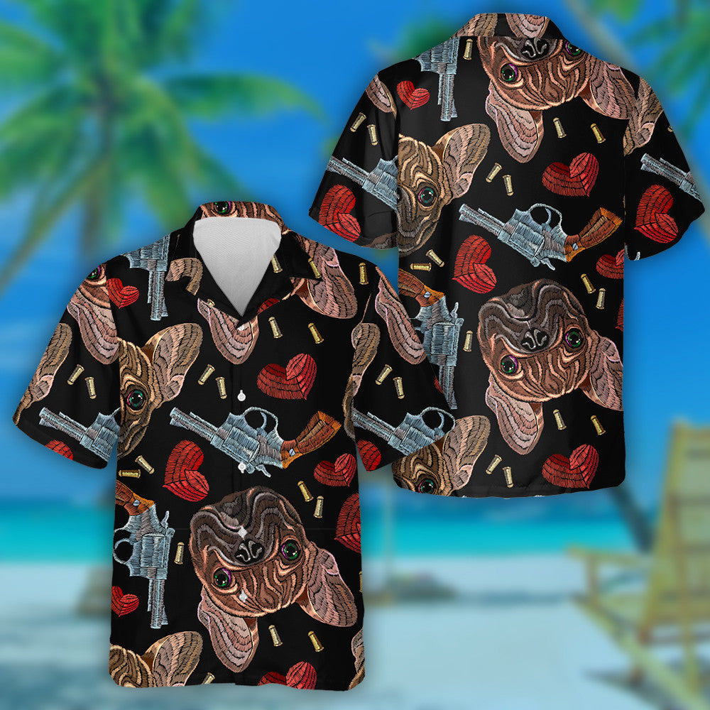 Embroidery Gangster Bulldog Hearts And Guns Hawaiian Shirt,Hawaiian Shirt Gift, Christmas Gift