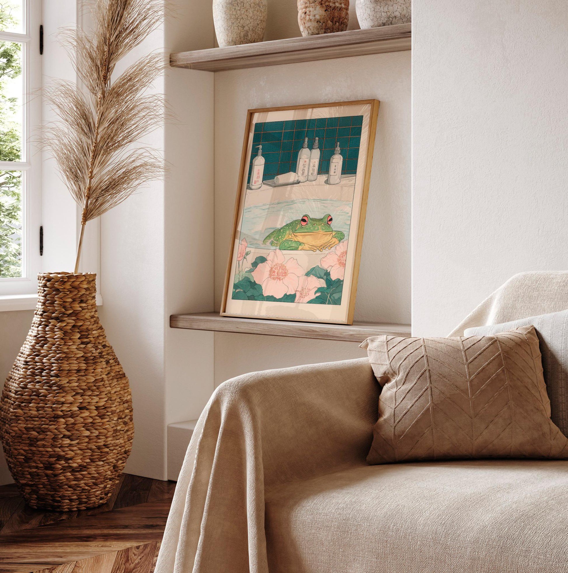 Frog in Bathtub Art Print: Japandi Bathroom Wall Decor