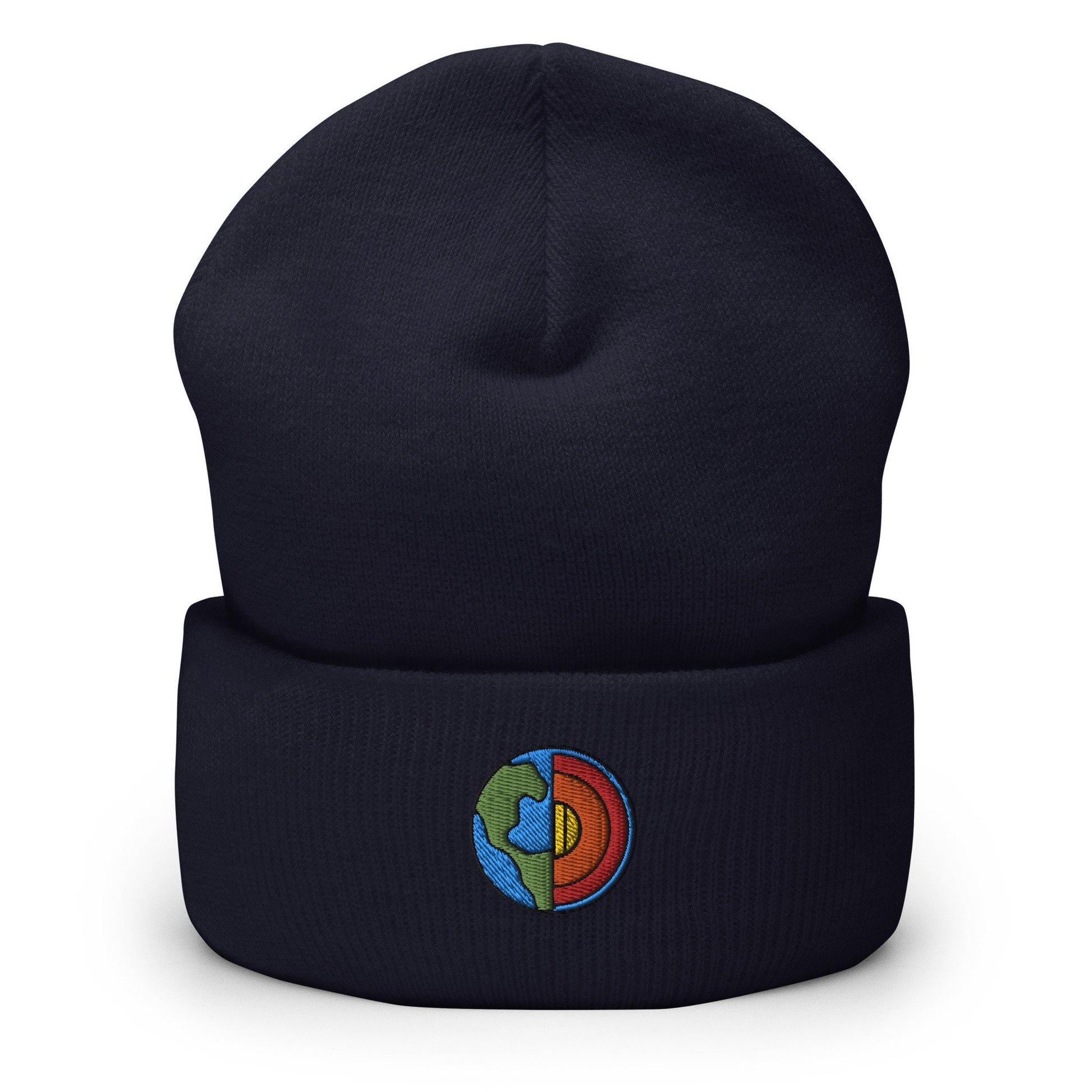 Geologist Planet Earth Core Embroidered Beanie, Handmade Cuffed Knit Unisex Slouchy Adult Winter Hat Cap Gift