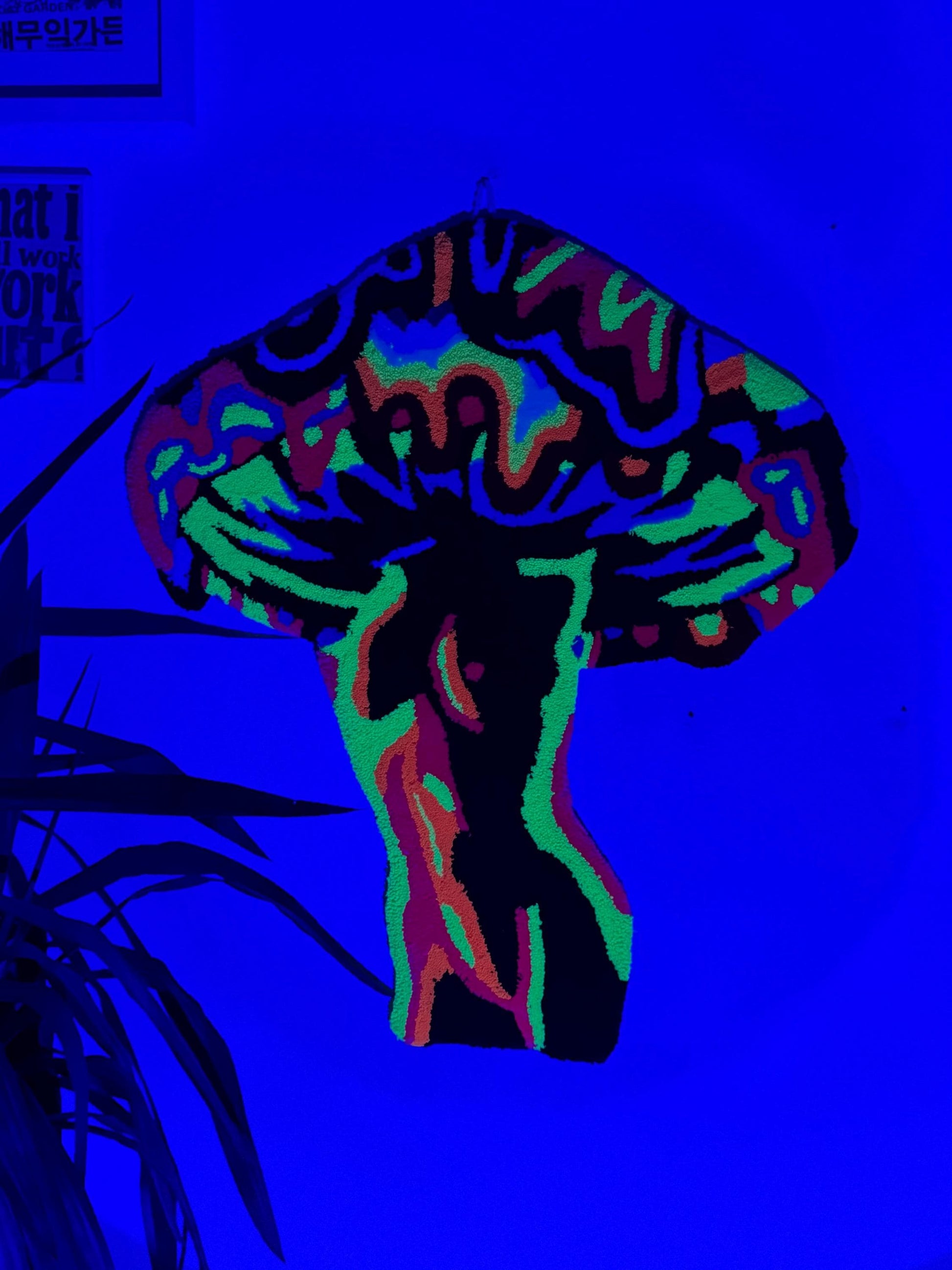 Glow in the Dark Mushroom Woman Rug – Handmade 3D Tufted Psychedelic UV Reactive Wall Art & Floor Carpet