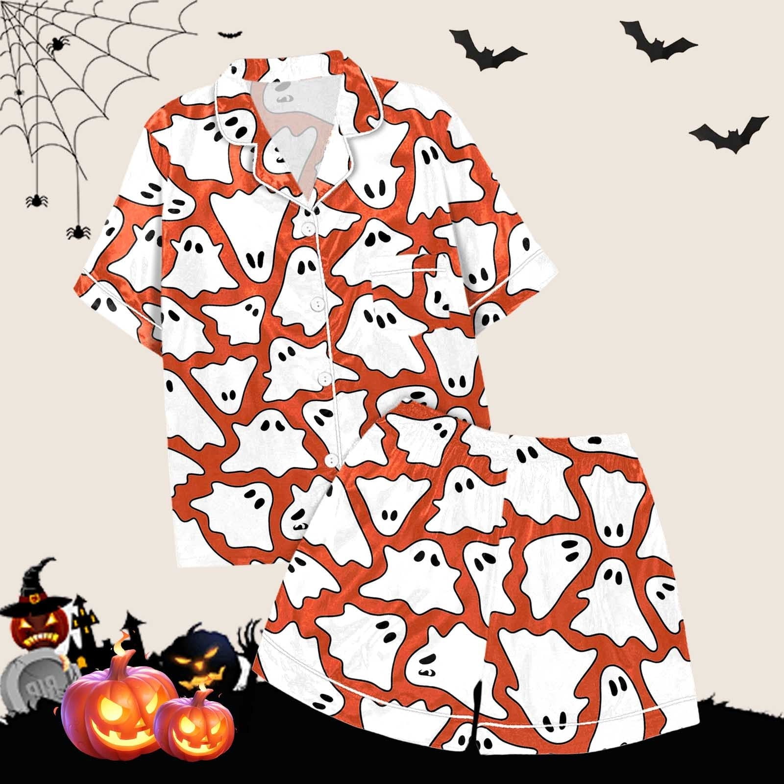 Halloween Blue Pajamas for Women Set Women Pajamas Graphic Printed Silk Satin Cute Sleepwear Buttons Short Sleeve Tops Shorts Sets Womens Sleepwear_Orange_M