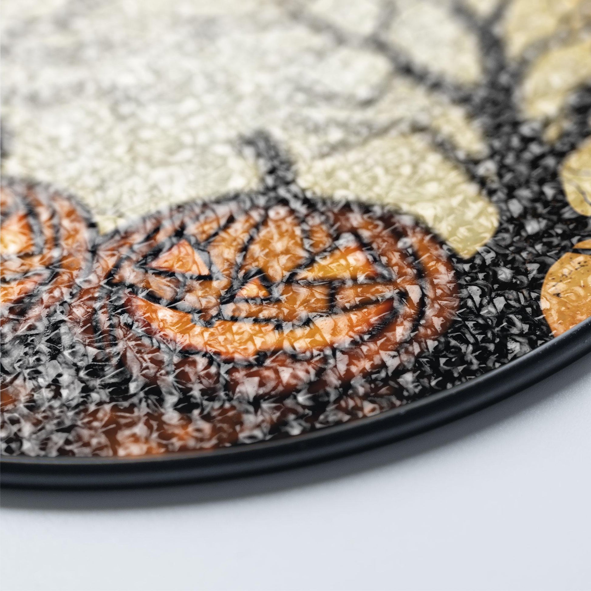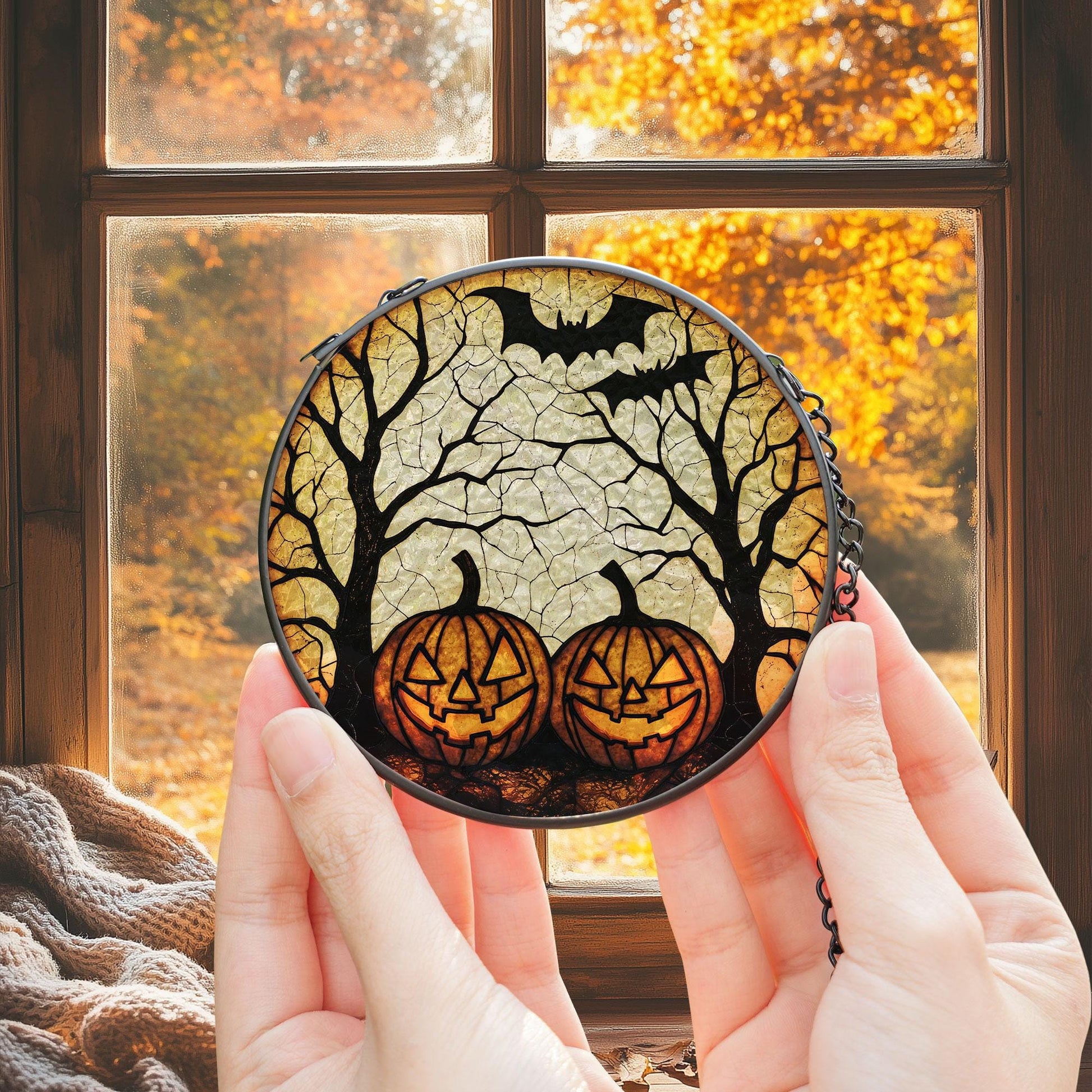 Halloween Jack-O’-Lantern Pumpkin Stained Glass – Spooky Tree & Bat Window Hanging, Gothic Fall Suncatcher for Haunted House or Autumn Decor
