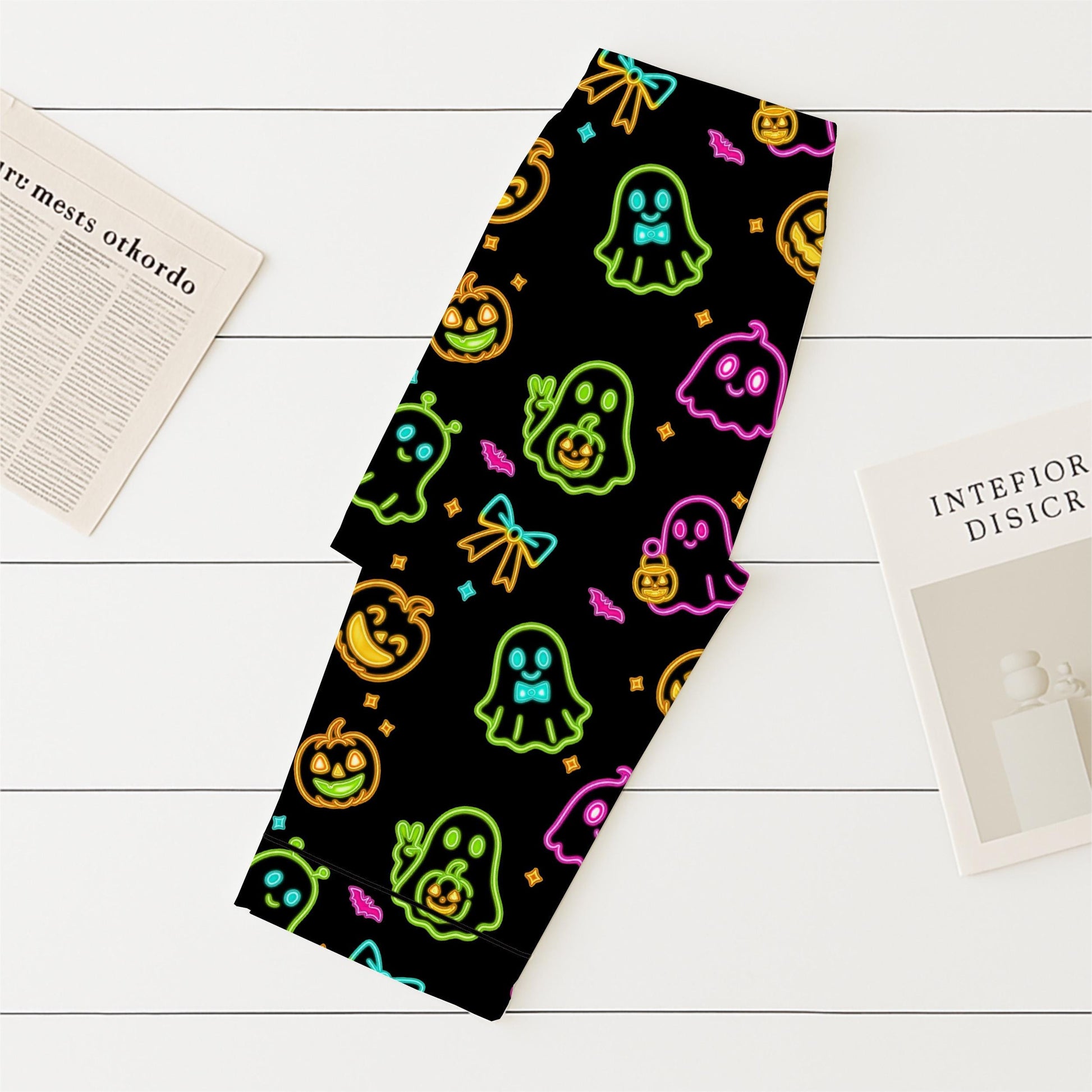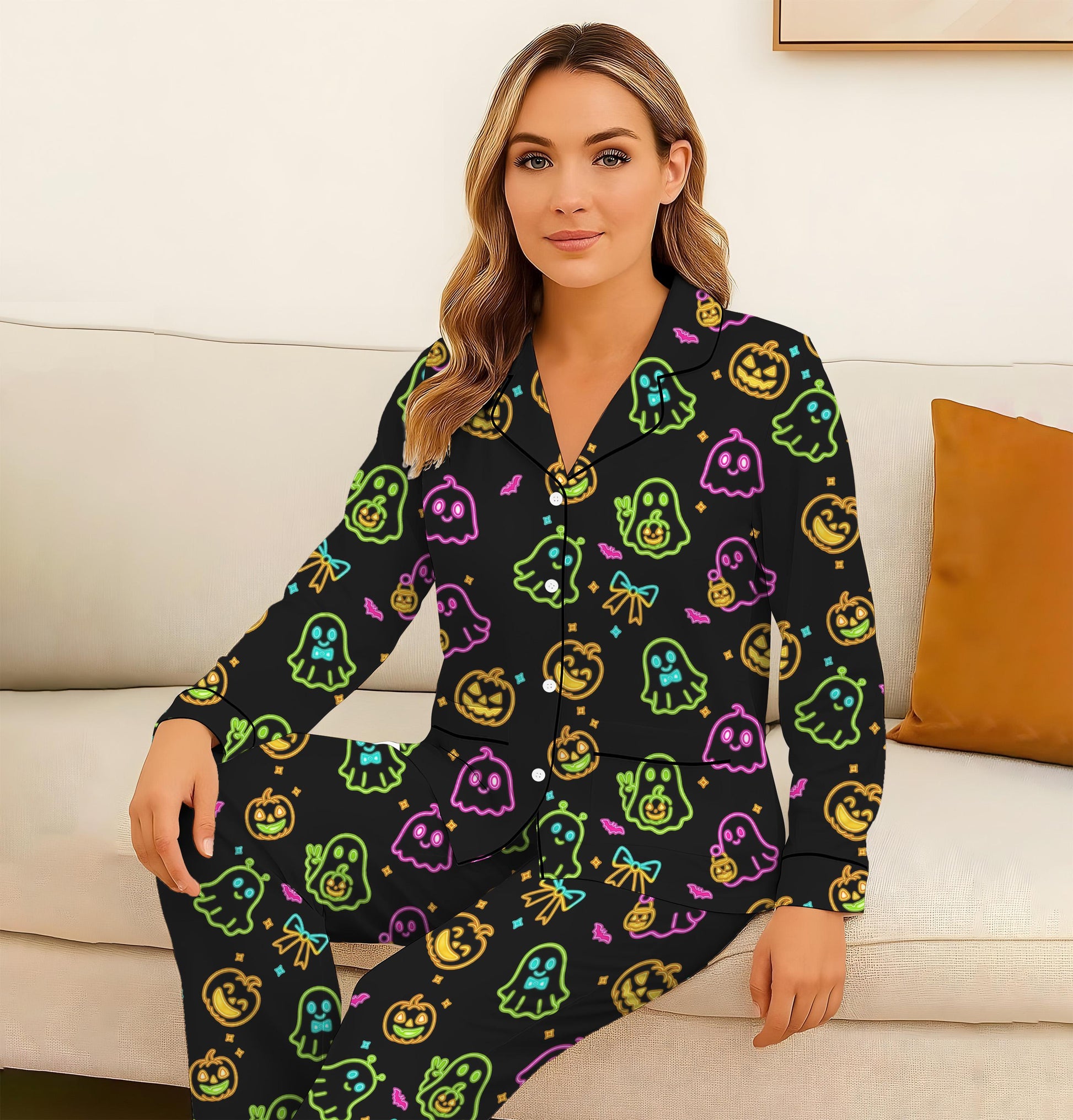 Halloween Neon Ghost And Pumpkin Pajamas Set, Cute Boo Sleepwear, Cozy Loungewear, Spooky Season Gift, Black Homewear, Halloween Gift