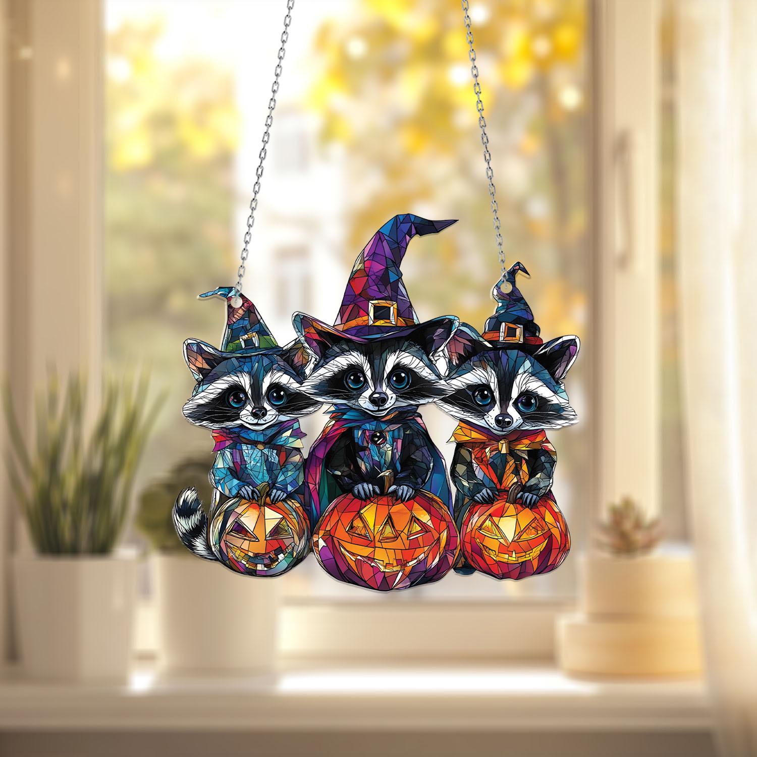 Halloween Raccoon Window Hanging – Cute Witchy Pumpkin Decor for Fall, Spooky Animal Gift for Kids, Halloween Home Accent for Trick or Treat