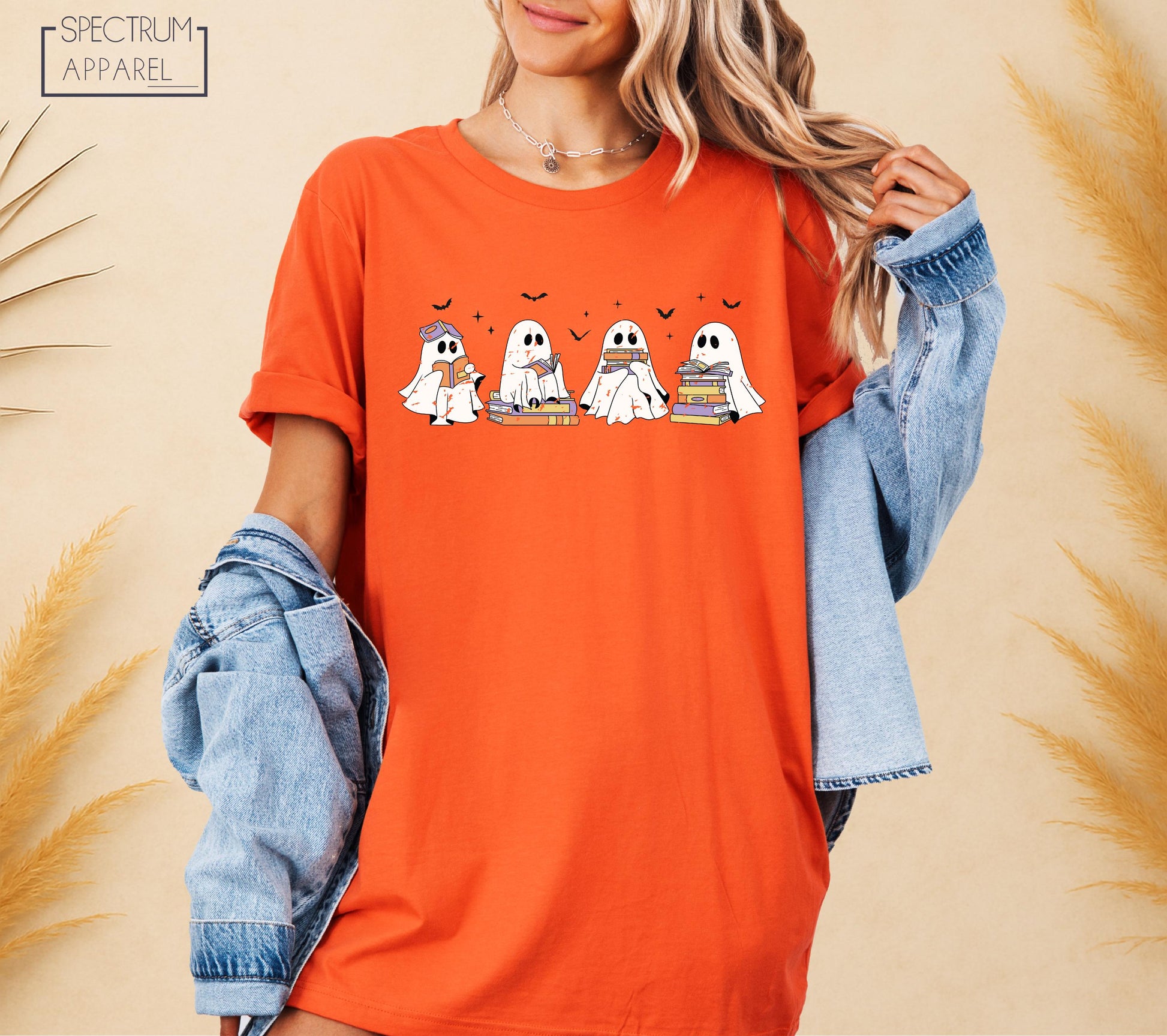 Halloween Reading Ghosts T-Shirt, Bookworm Ghost Fall Tee, Spooky Season Reading T-Shirt, Cute Ghost Book Stack Shirt, Autumn Reading Tee