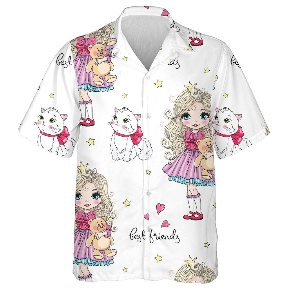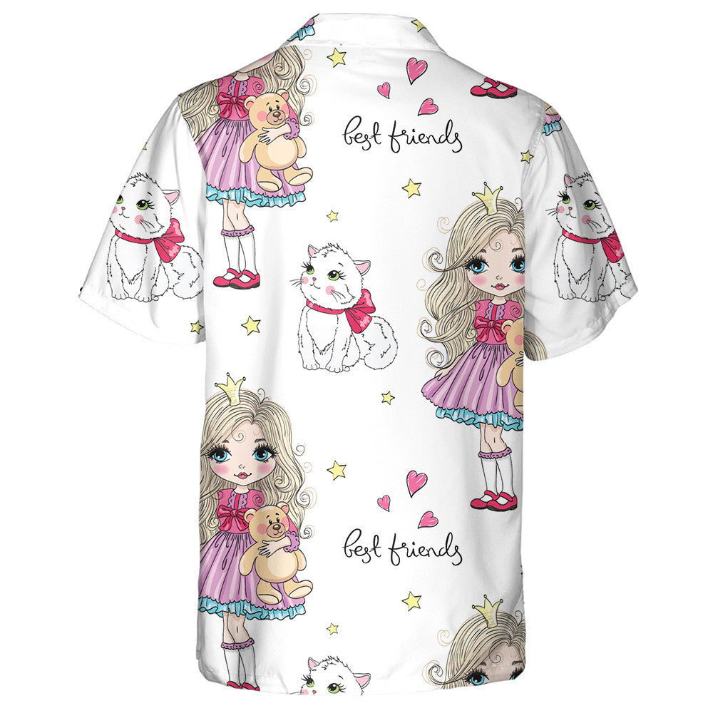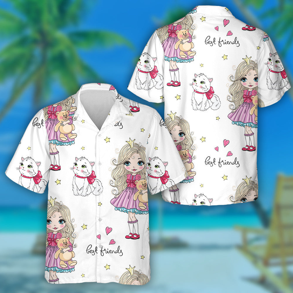 Hand Drawn Cute Little Princess Girl And Cat Hawaiian Shirt, Hawaiian Shirt Gift, Christmas Gift