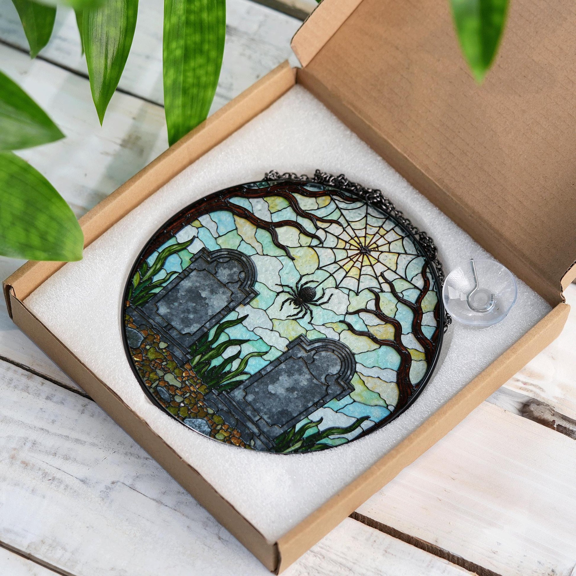 Haunted graveyard spider web suncatcher Halloween window hanging gift for spooky decor lovers