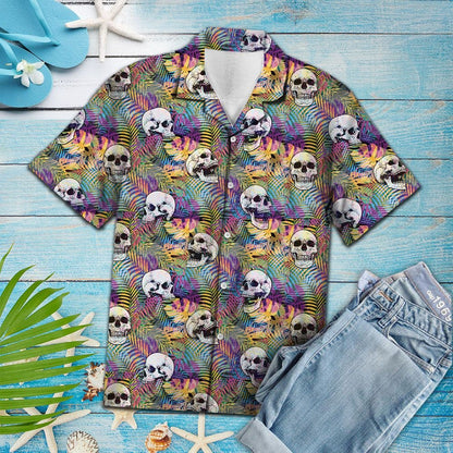 Hawaiian Shirt Neon Jungle With Tropical Flowers And Gray Skull Heads, Hawaiian Shirt Gift, Christmas Gift