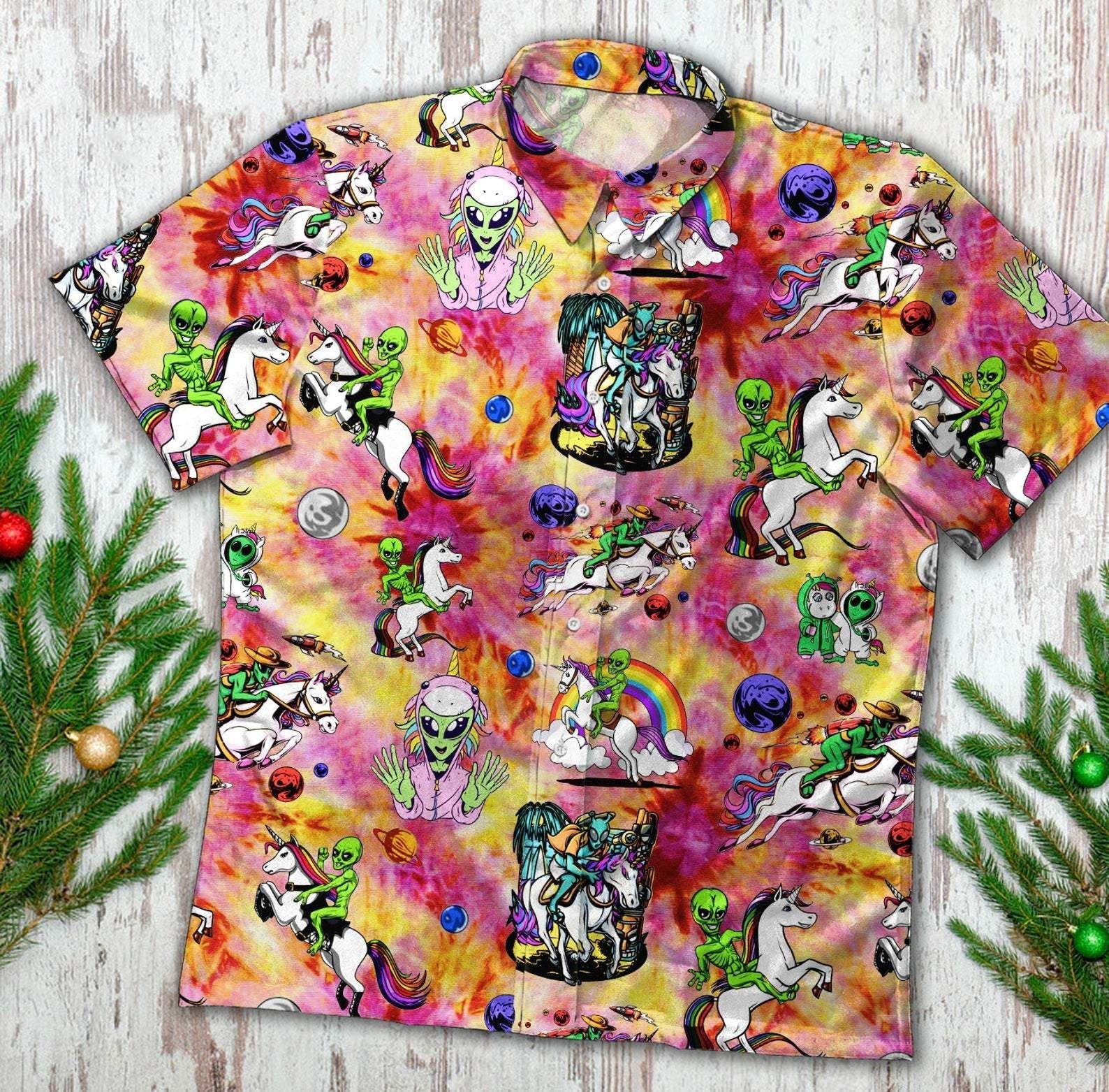 Hippie Trippy Alien Riding Unicorn Hawaiian Shirt, Hawaiian For Gift