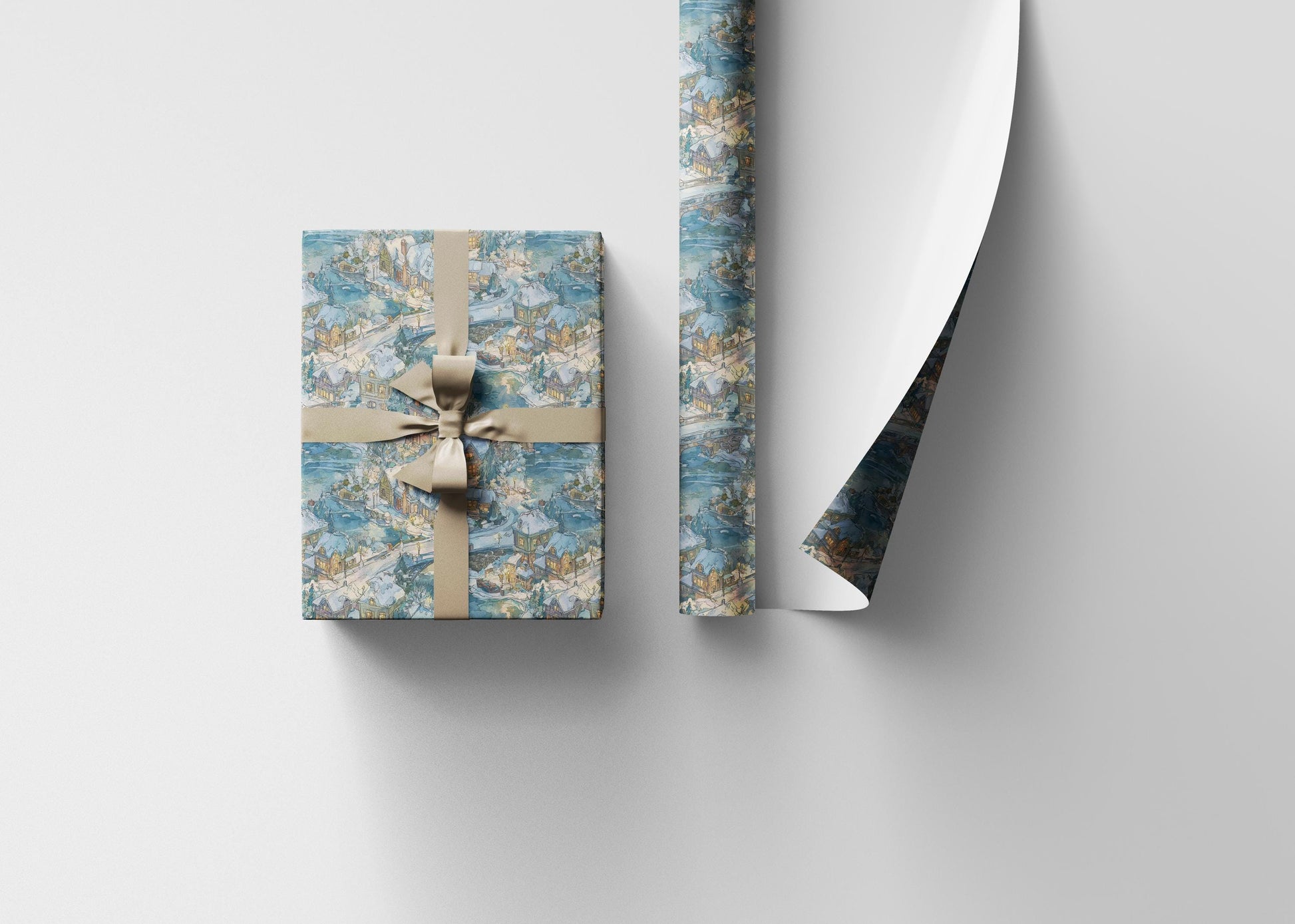 Holiday Wrapping Paper Roll with Snowy Village Homes and Christmas Lights #21