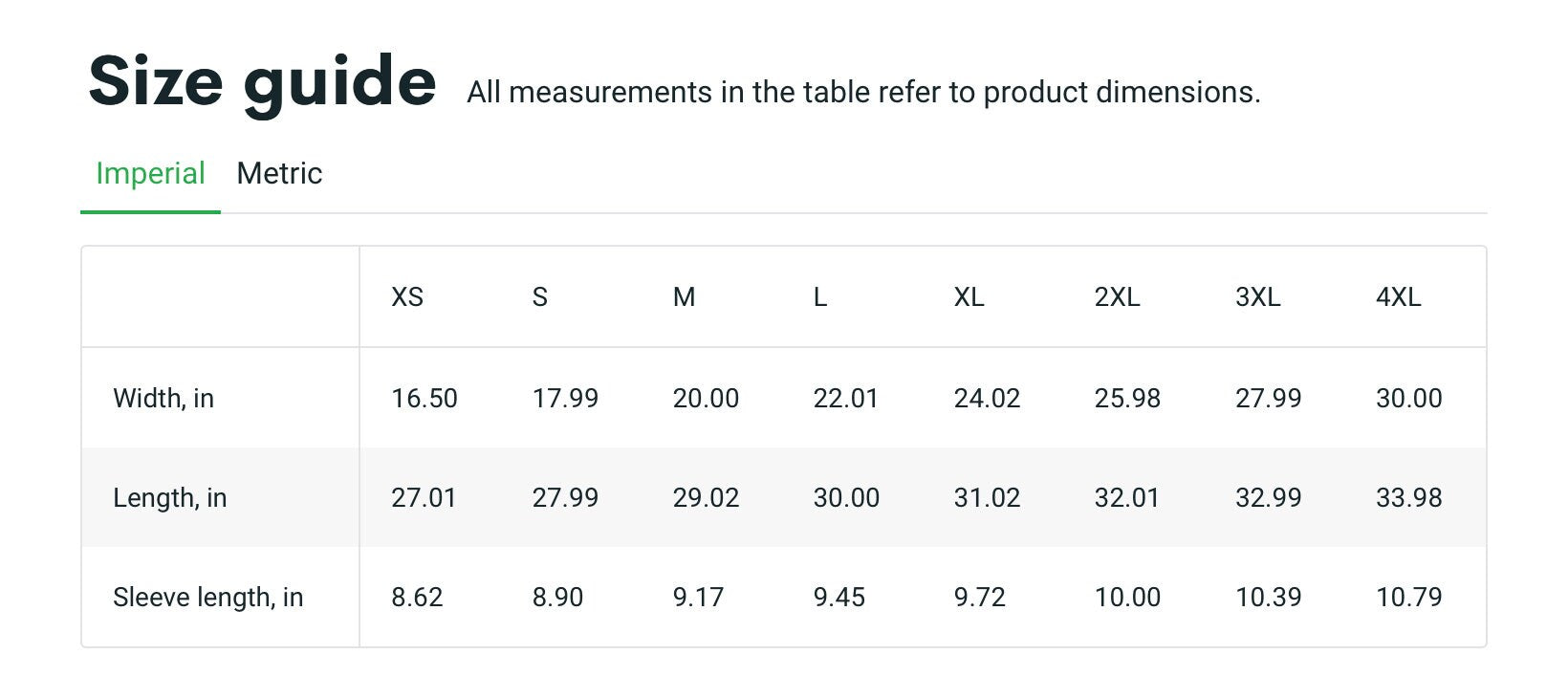 | SIZE | LENGTH (in) | WIDTH (in) | SLEEVE CENTER BACK (in) |