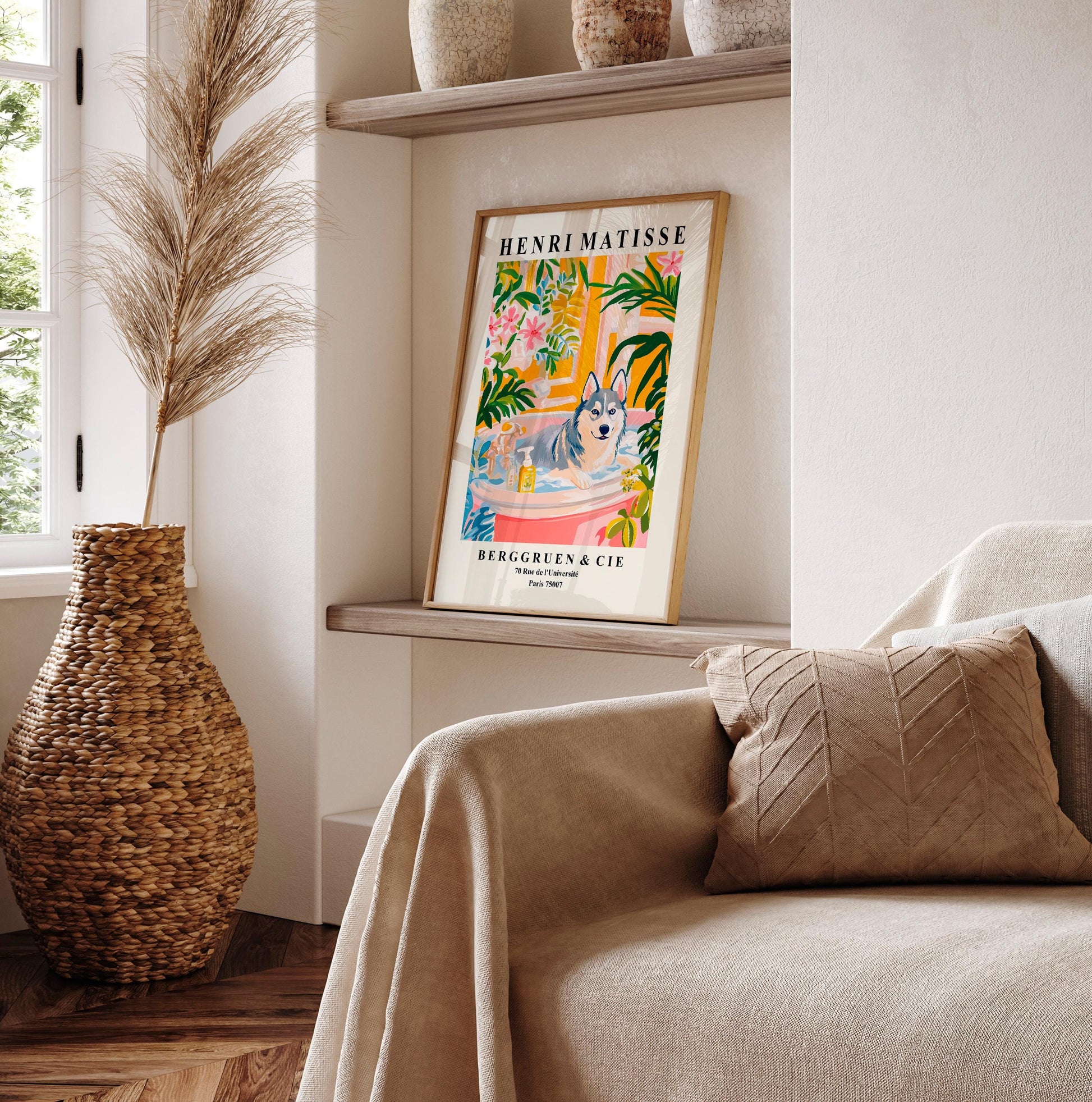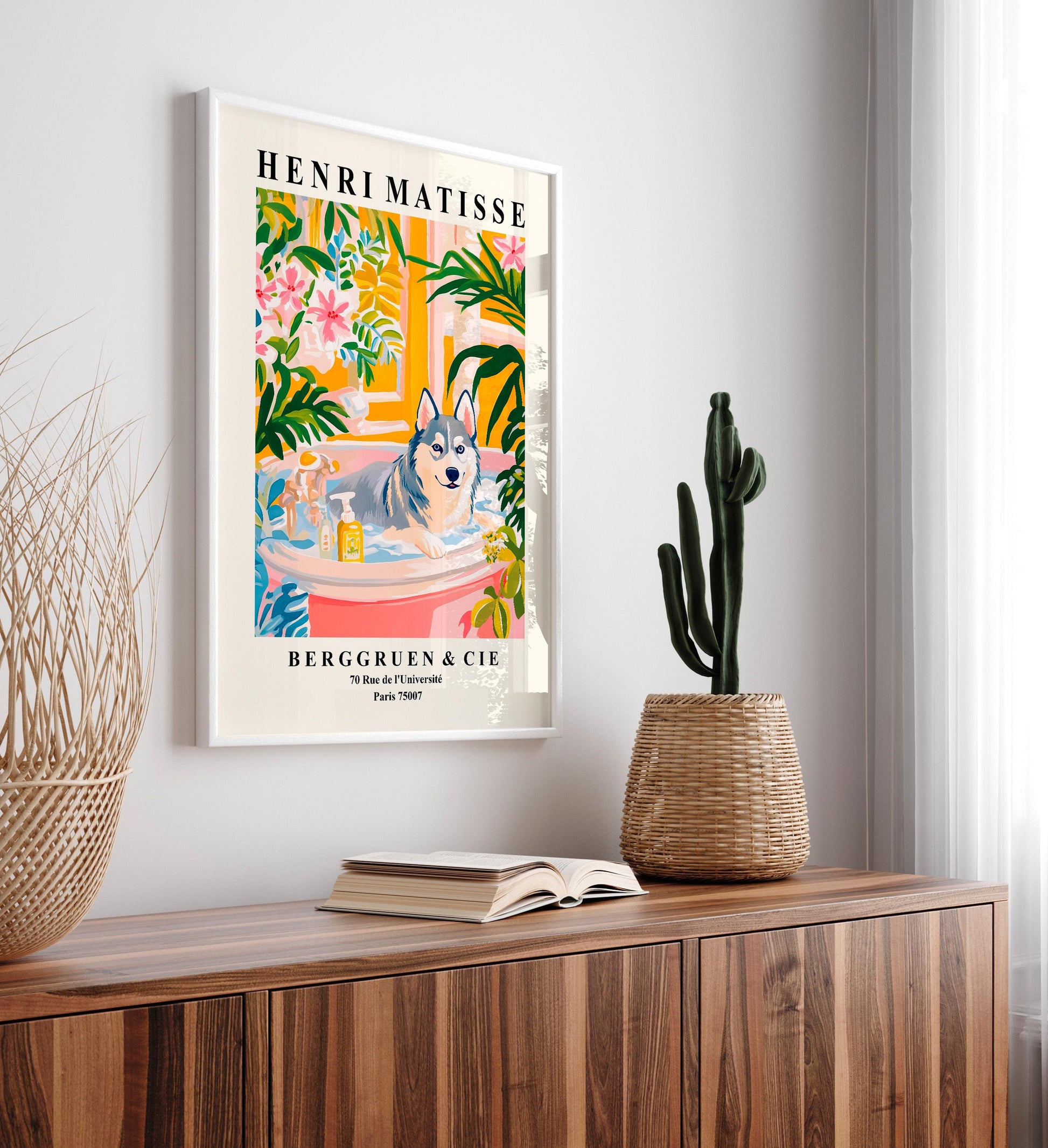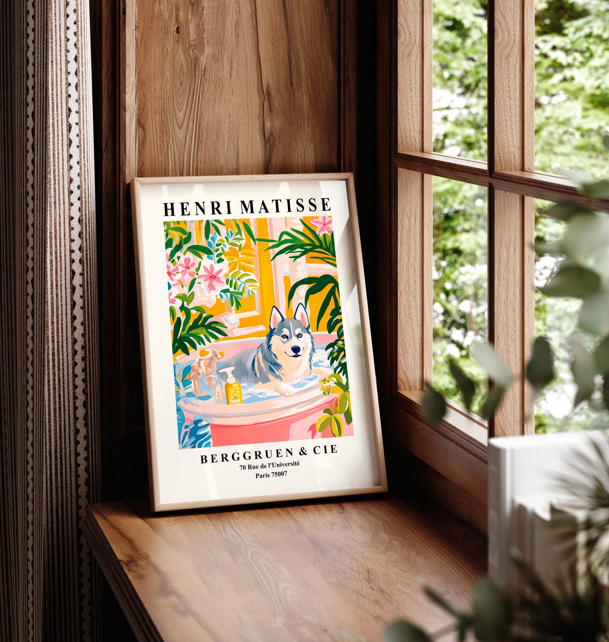 Husky in Bathtub Art Print: Matisse Style Dog Poster for Bathroom