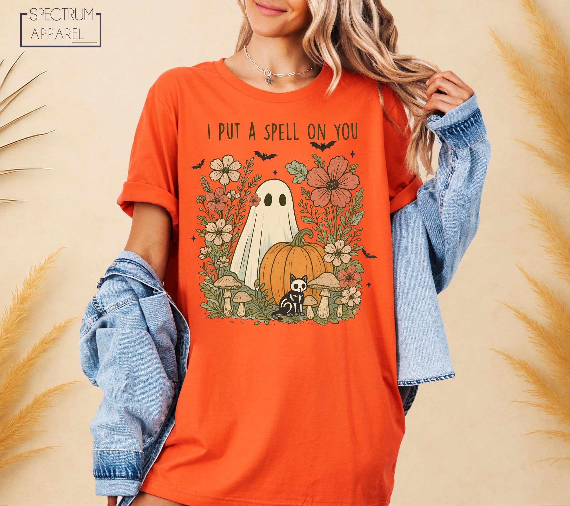 I Put A Spell On You T-Shirt, Spell On You Halloween T-Shirt, Ghost In Flowers Shirt, Cute Skeleton Cat Shirt, Spooky Floral Pumpkin T-Shirt