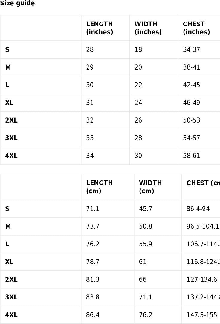 | SIZE | LENGTH (in) | WIDTH (in) | SLEEVE CENTER BACK (in) |
