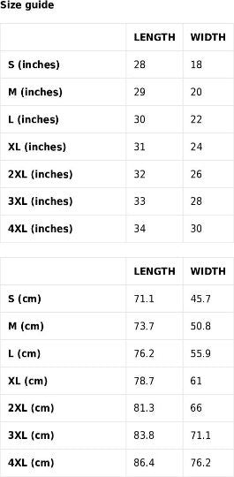 Measured laid flat; allow ±0.5" tolerance.