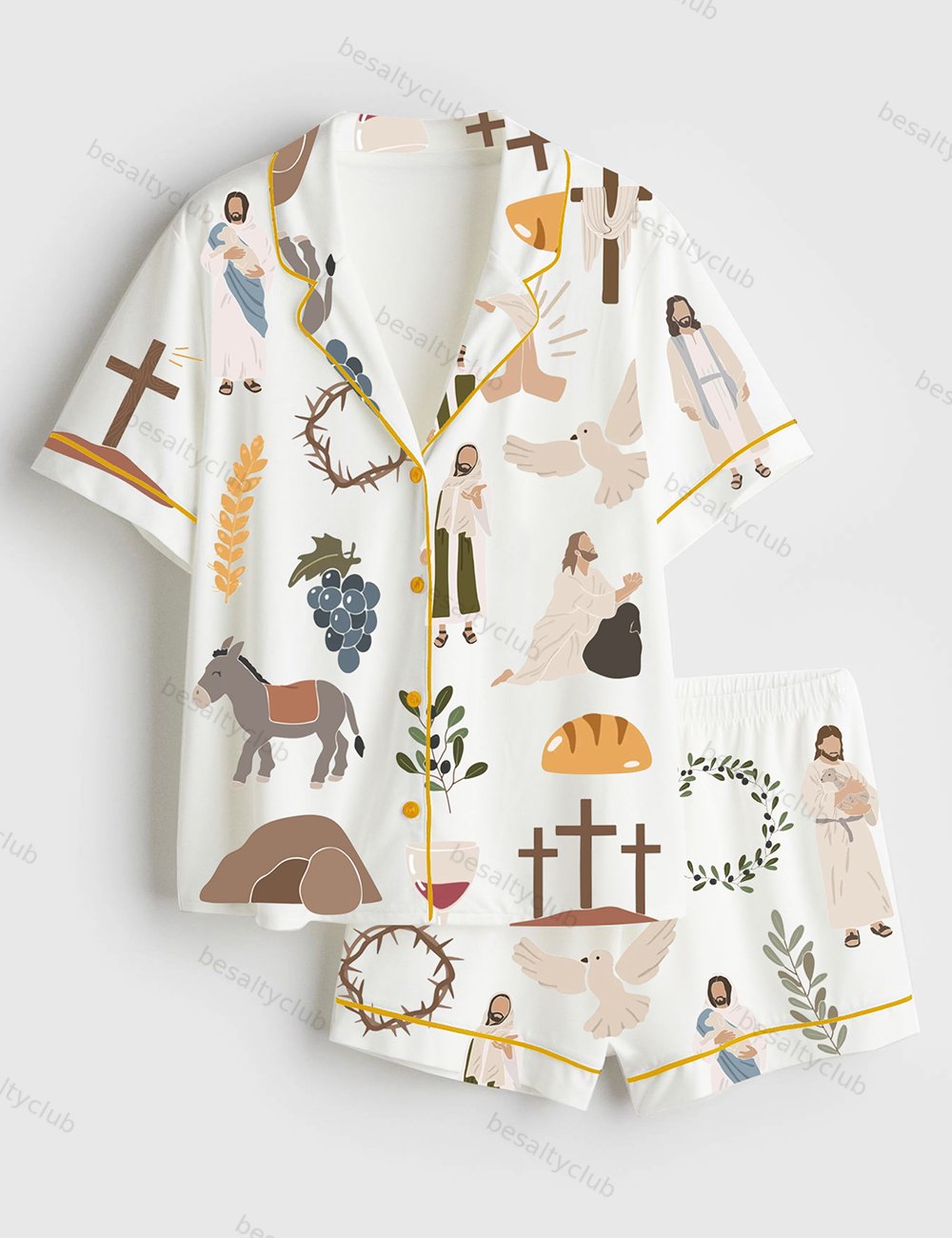 Jesus Christian Bible Peace Love Faith Wine Short Sleeve Satin Pajama Set