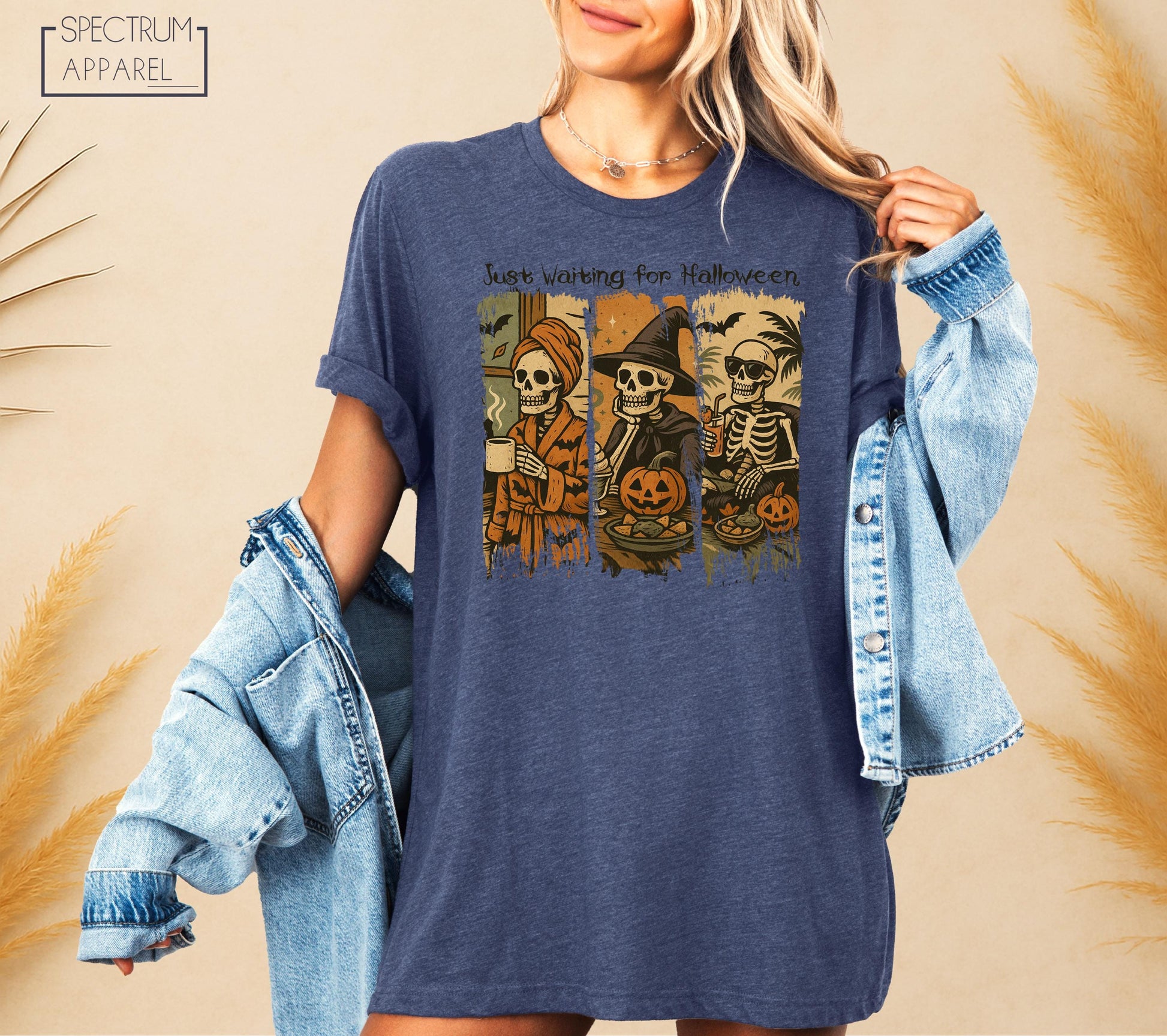Just Waiting For Halloween T-Shirt, Funny Just Waiting For Halloween Shirt, Fall Pumpkin Skeleton Tee, Cute Halloween Vibes Skeleton T-Shirt
