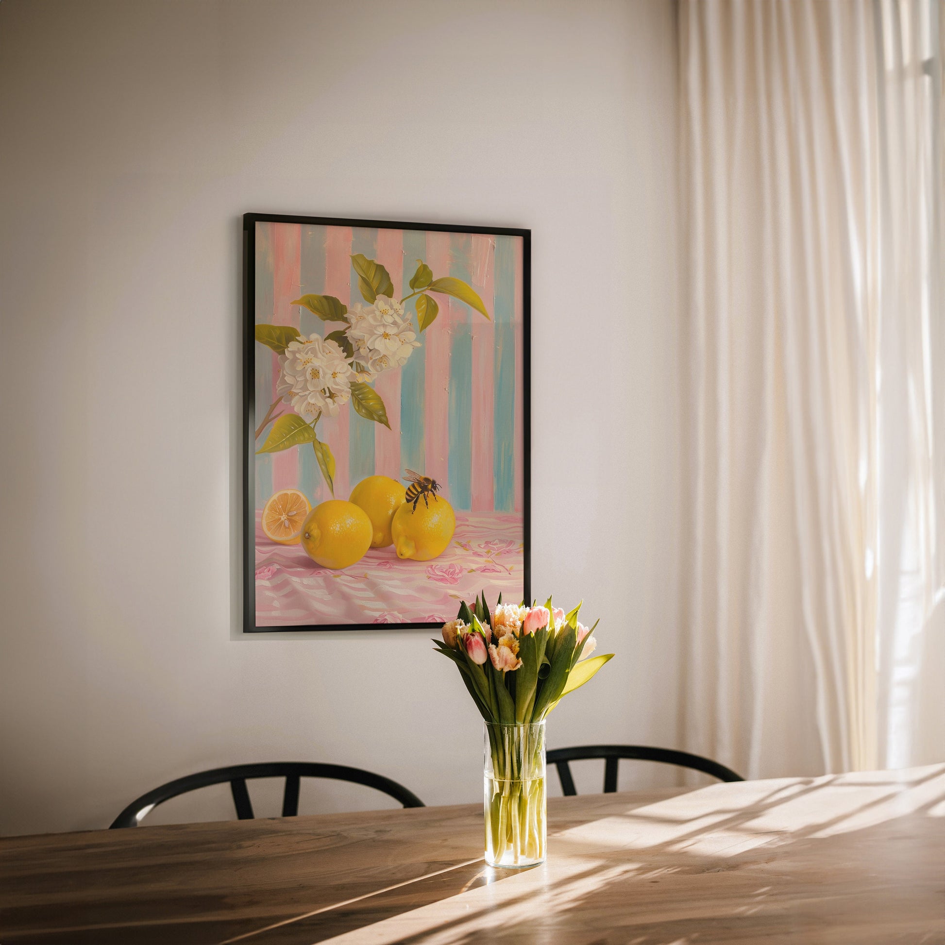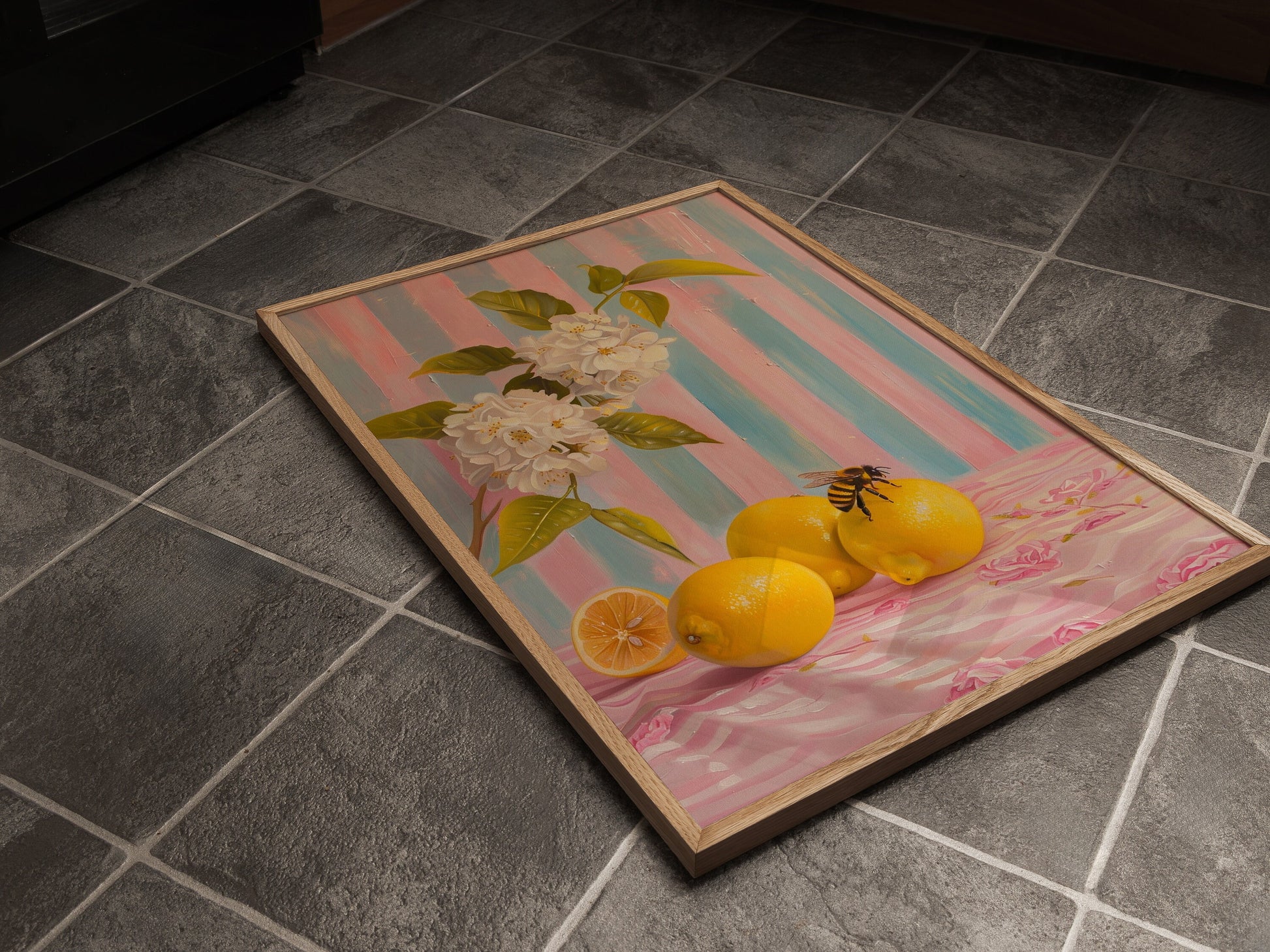 Lemons And Bumble Bee Kitchen Print, Mediterranean Poster, Kitchen Wall Art, Farmhouse Country Aesthetic Print, Summer Citrus Fruit Flowers