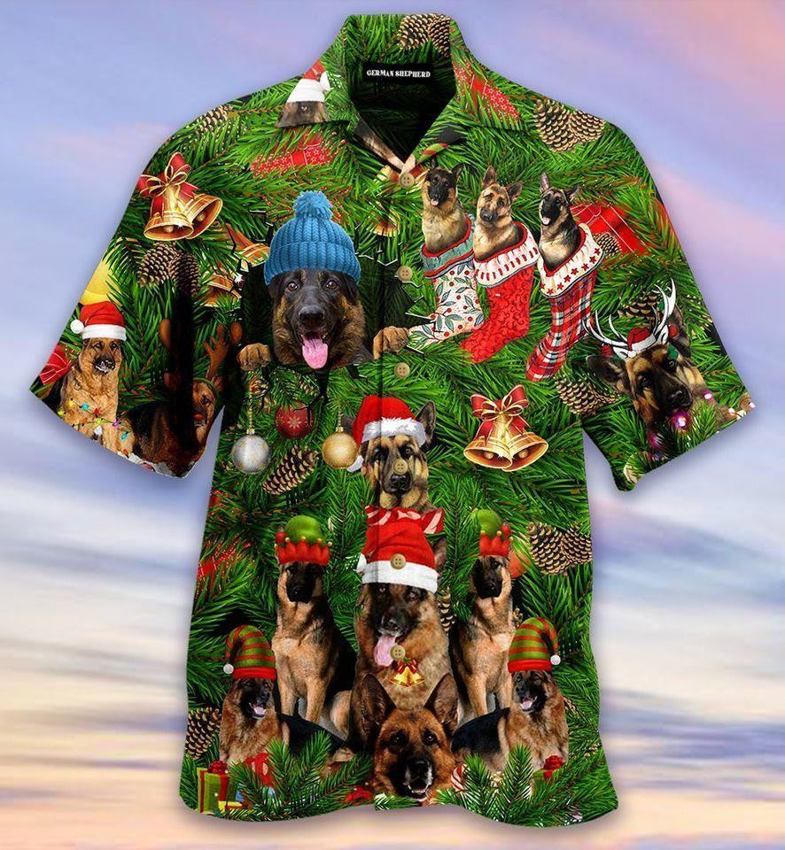 Lovely Christmas German Shepherd Green Leaves Background Hawaiian Shirt, Hawaiian Shirt Gift, Christmas Gift