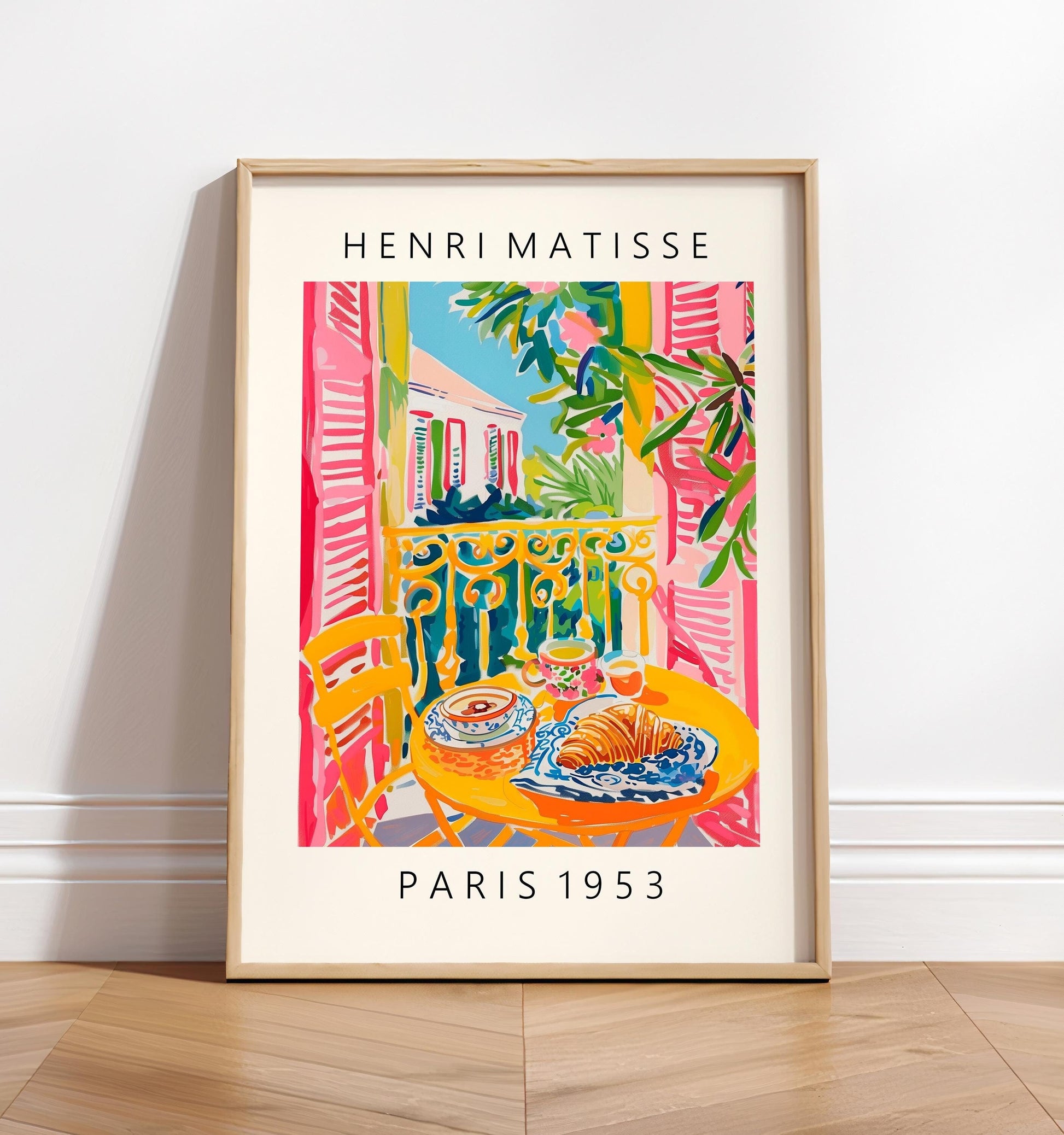 Matisse Style Coffee and Croissant Art Print: Pink Mid Century Poster