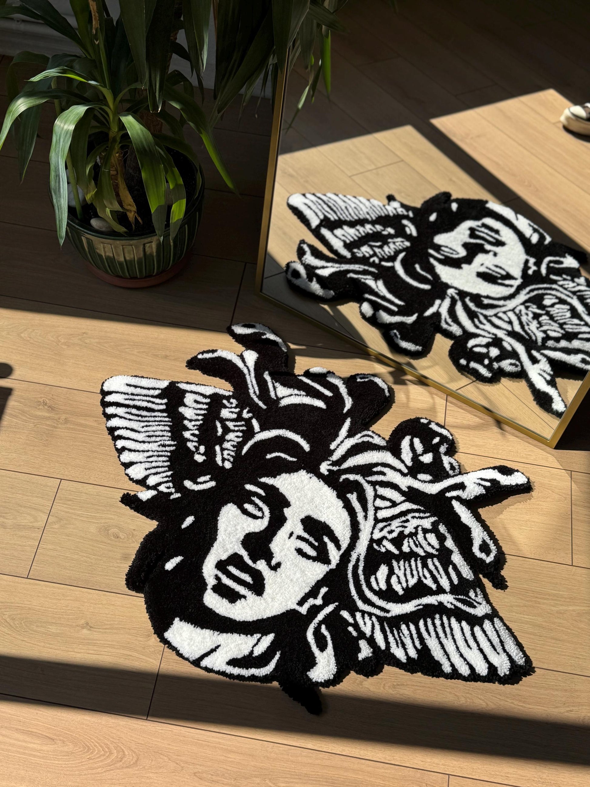 Medusa Tufted Rug – Handmade Fluffy Greek Mythology Carpet – Bold Statement Floor Art – 3D Textile Wall Decor
