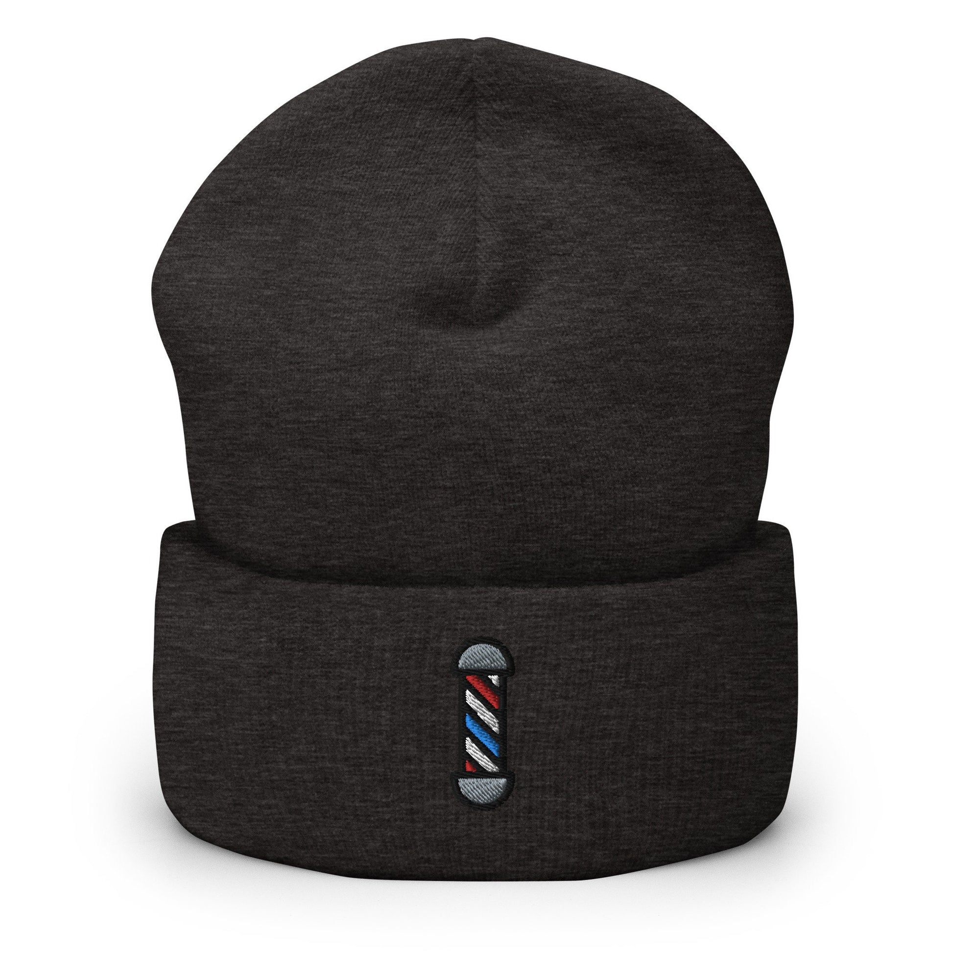 Men's Hair Stylist, Barbers Pole Embroidered Beanie, Handmade Cuffed Knit Unisex Slouchy Adult Winter Hat Cap Gift