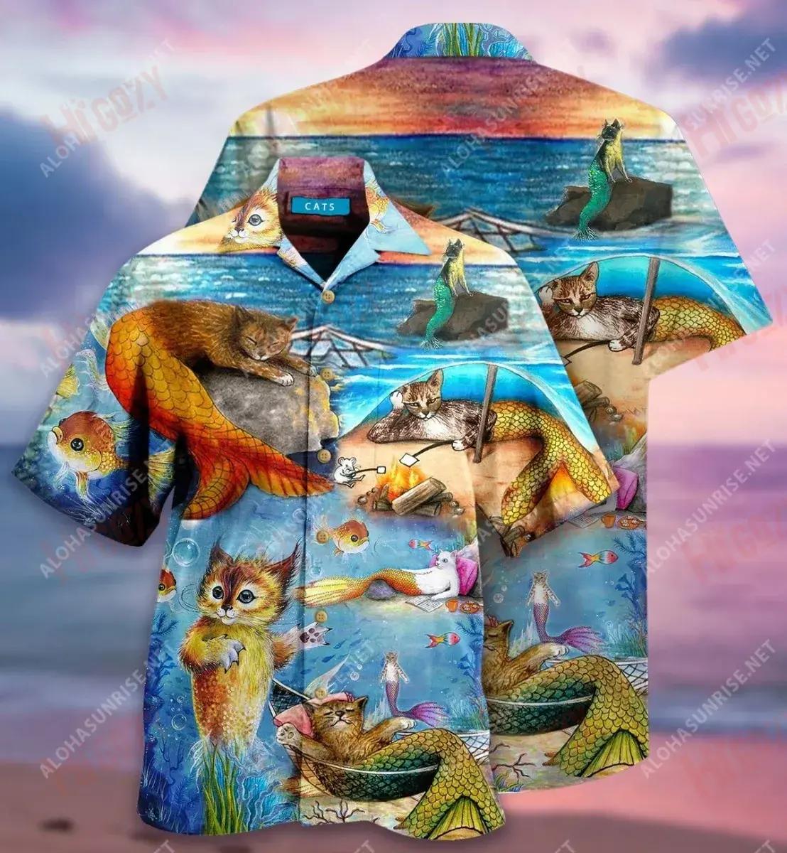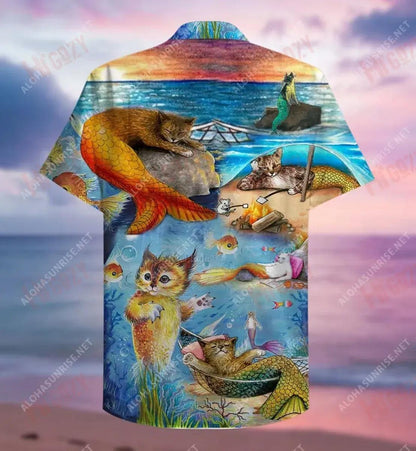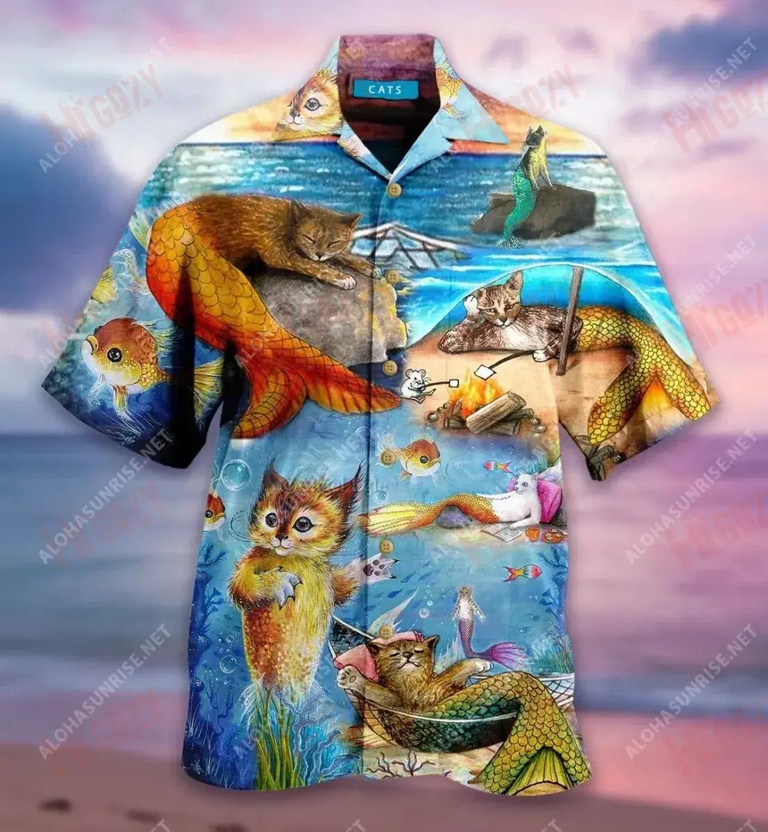 Mermaid Off Duty Cat Short Hawaiian Shirt Ocean Hawaiian T Shirts Hawaiian Crazy Shirts Hawaiian Shirts For Women, Hawaiian Shirt Gift, Christmas Gift