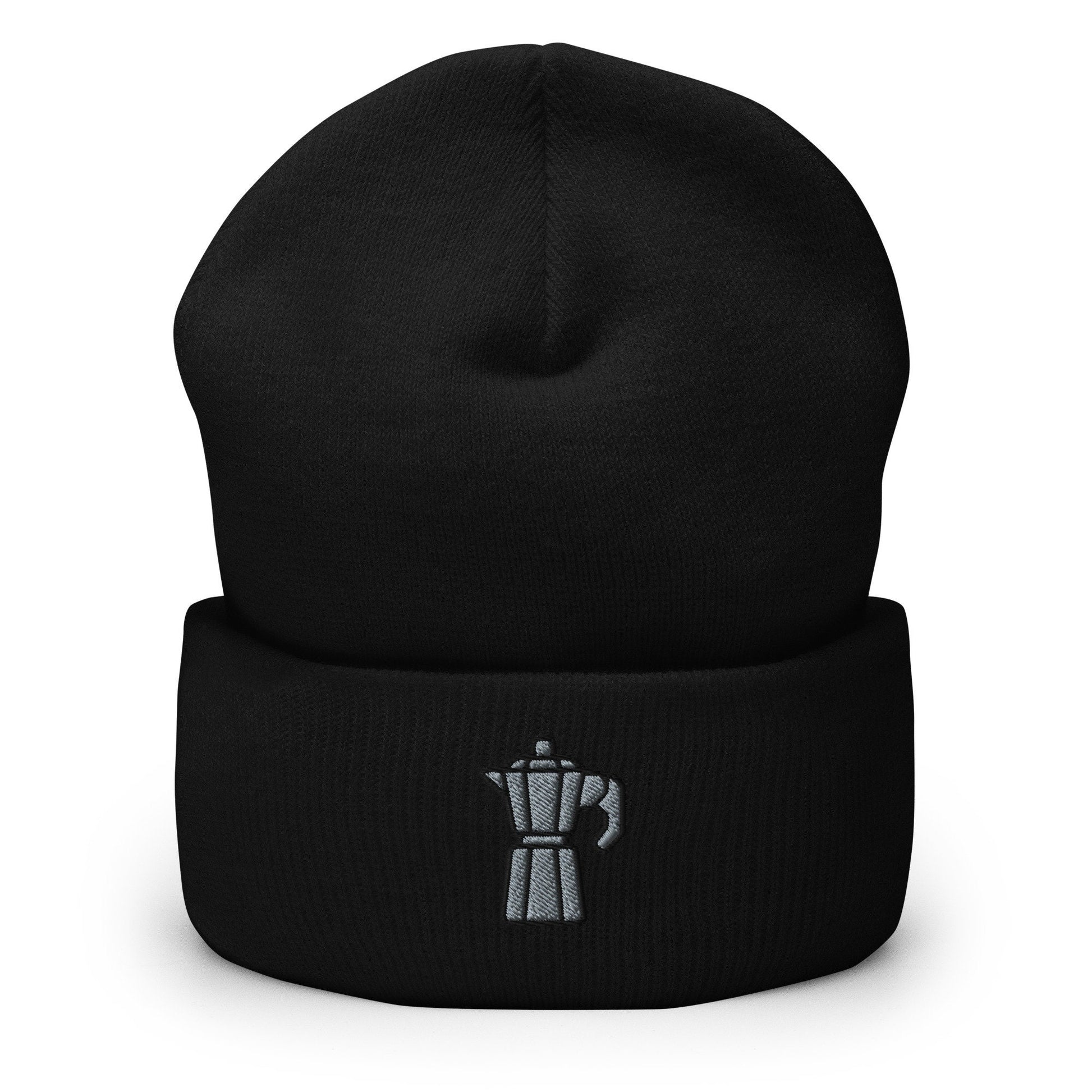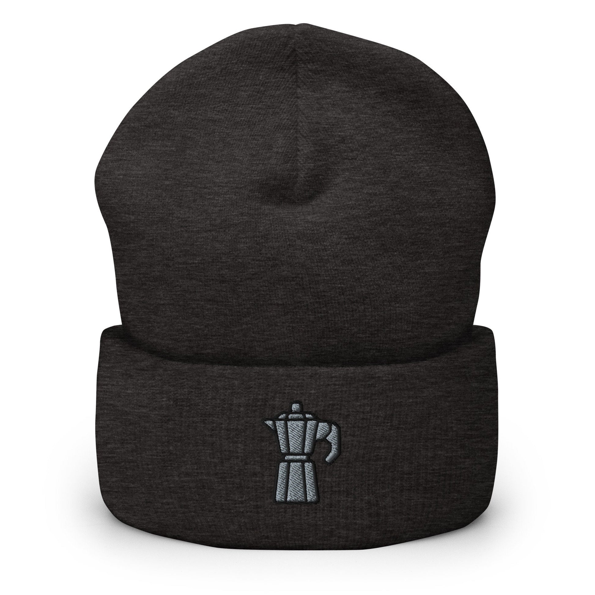 Moka Pot Coffee Maker Embroidered Beanie, Handmade Cuffed Knit Unisex Slouchy Adult Winter Hat Cap Gift