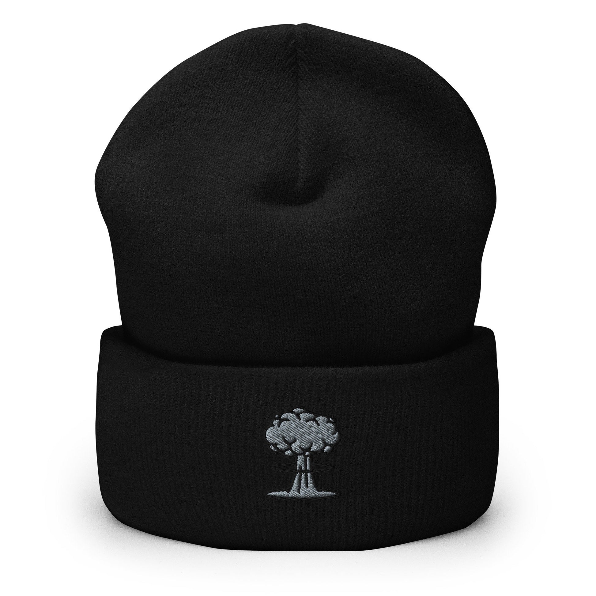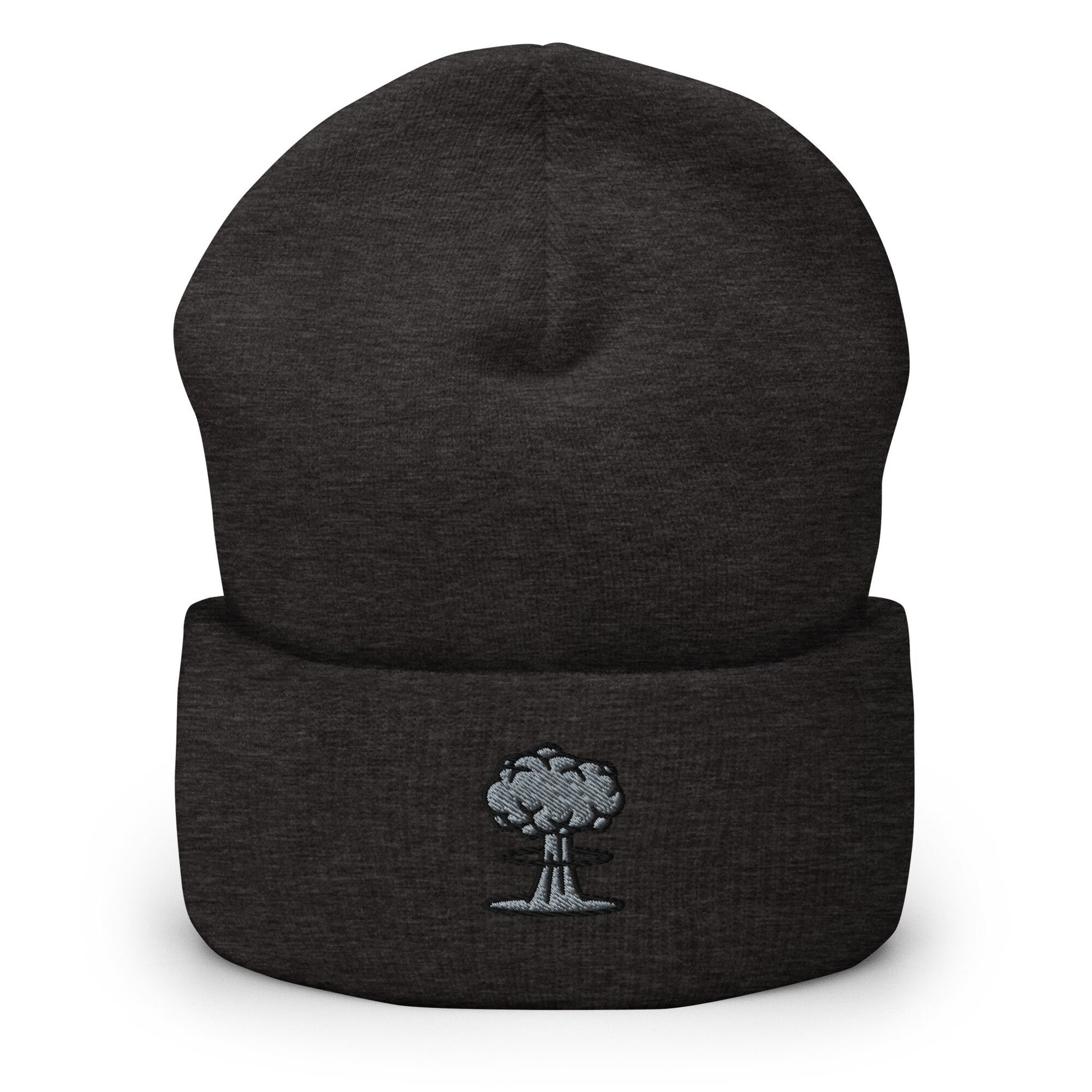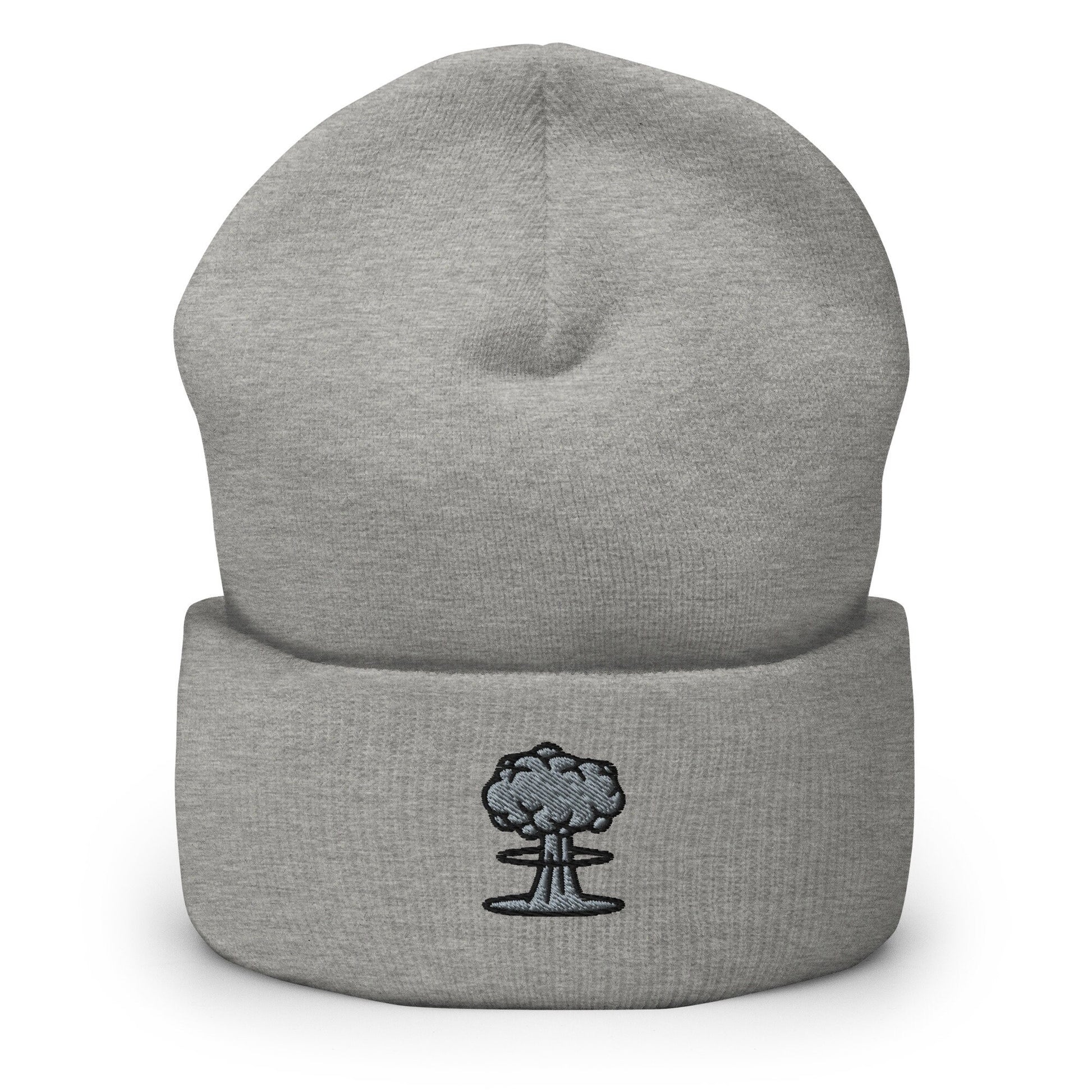 Mushroom Cloud Explosion Embroidered Beanie, Handmade Cuffed Knit Unisex Slouchy Adult Winter Hat Cap Gift