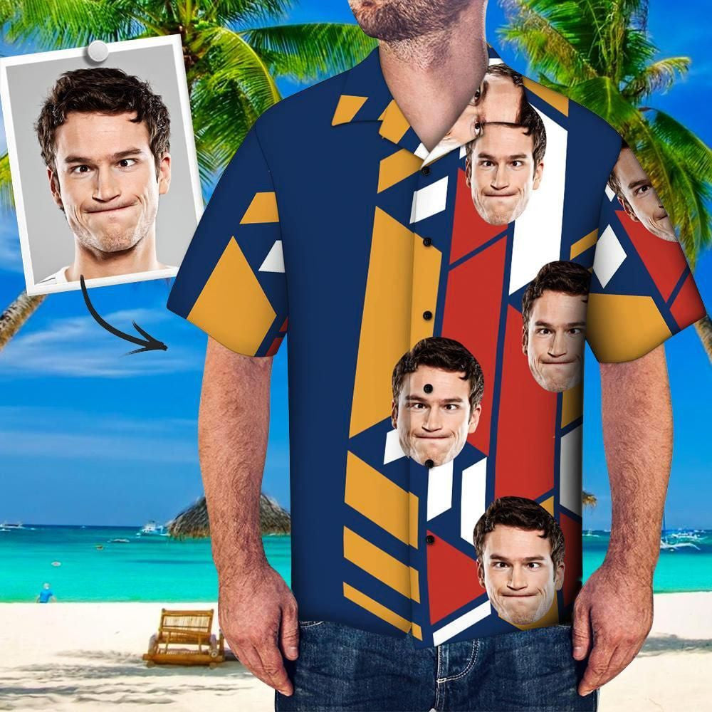 Navy And Red Yellow Geometric Custom Photo Hawaiian Shirt, Hawaiian Shirt Gift, Christmas Gift