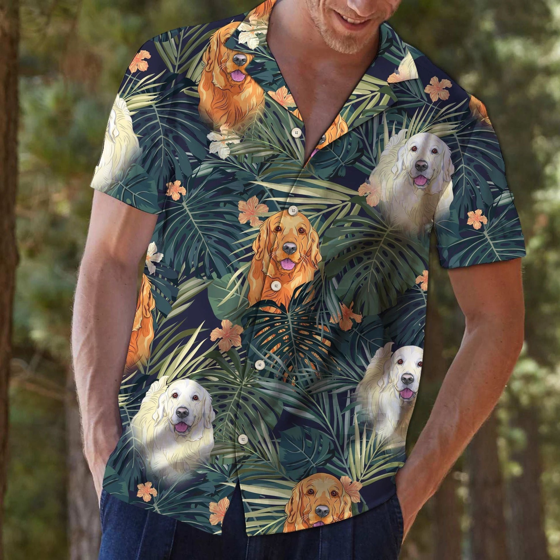 Nice Golden Retriever Among Flowers And Leaves Hawaiian Shirt, Hawaiian Shirt Gift, Christmas Gift