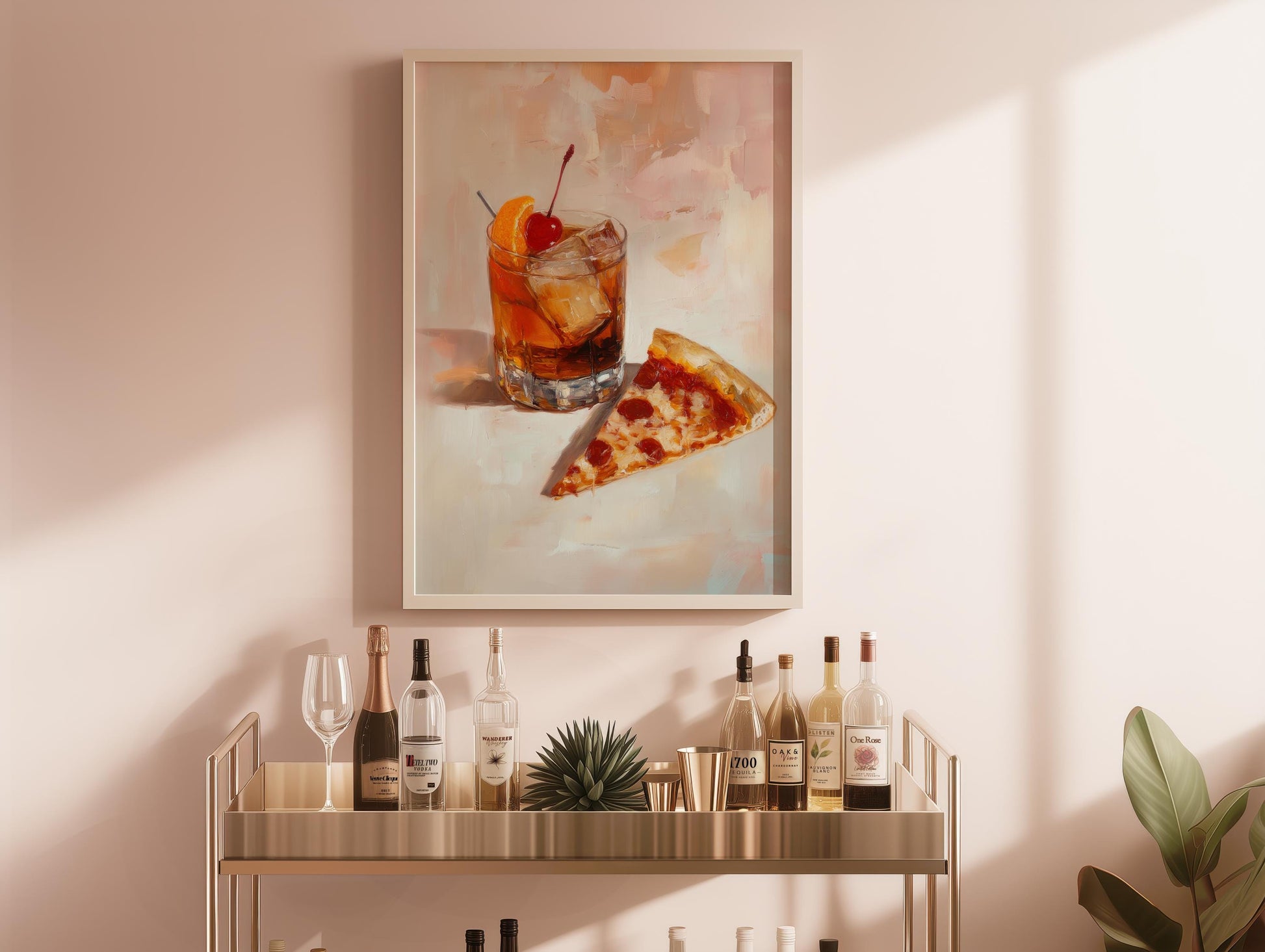 Old Fashioned Cocktail with Pizza Slice Art Print | Cute Quirky Whimsical | Cocktail Bar Cart Decor | Pizza Art Gift | Trendy Home Wall Art