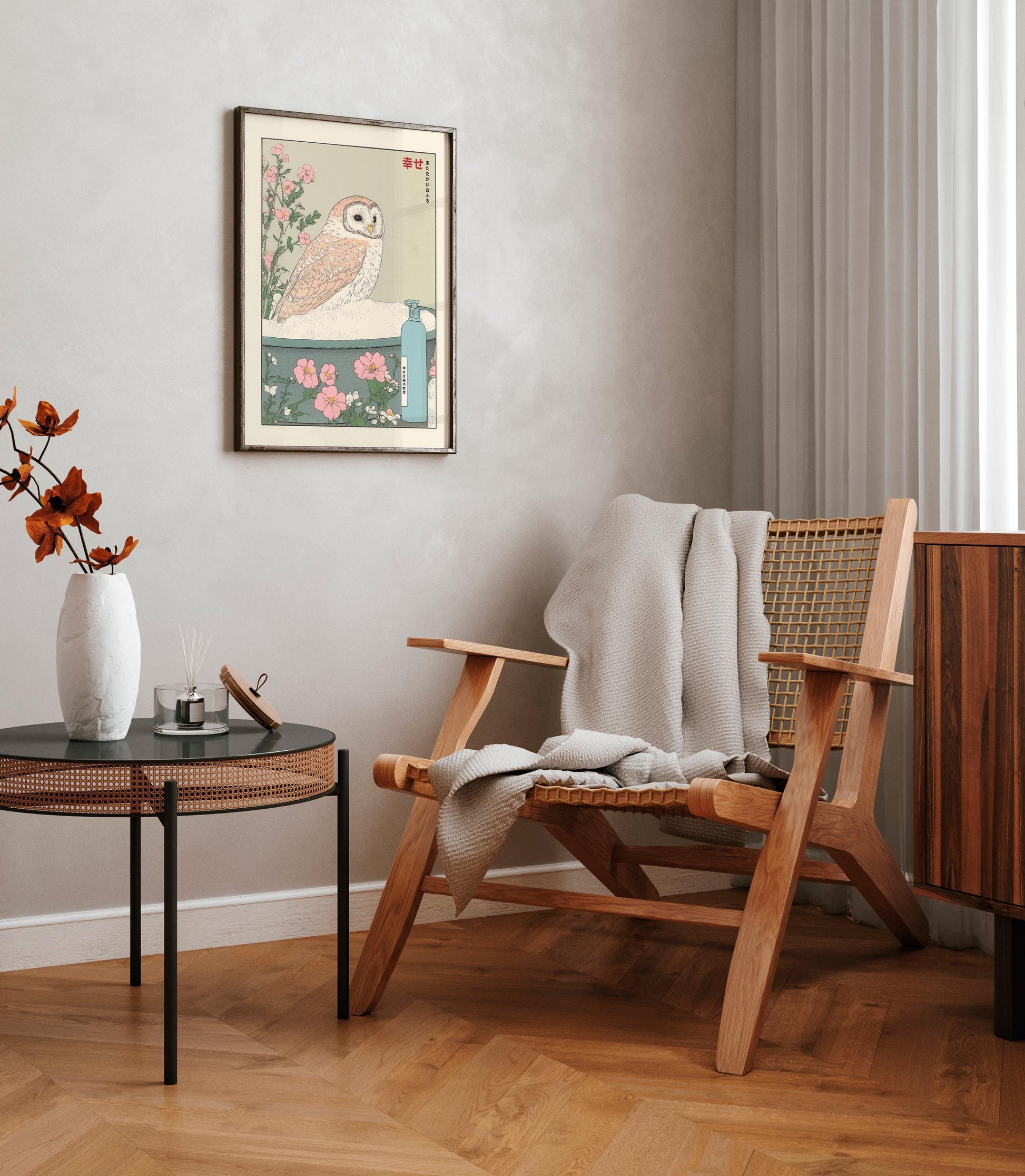 Owl in Bathtub Ukiyo-e Print: Japandi Bathroom Art